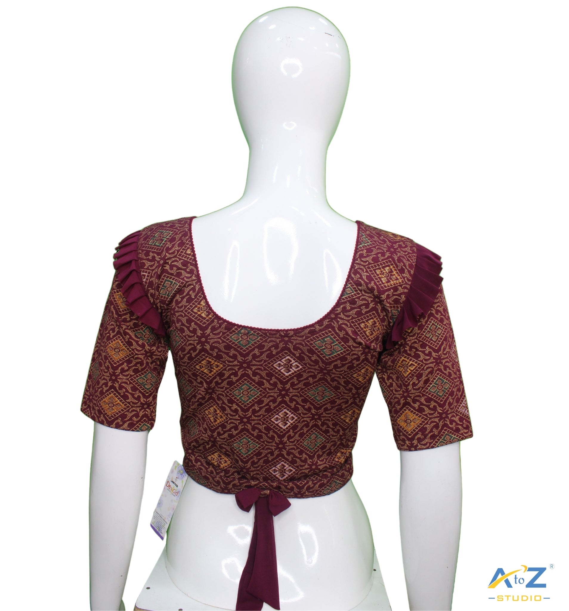 Add a touch of elegance with this Wine Crush Fabric Blouse, featuring an stylish Round Neck Front and Round Neck Back with a Belt and Bow Detail. The Elbow Sleeves and kite print design make it a versatile and chic choice for any occasion.
