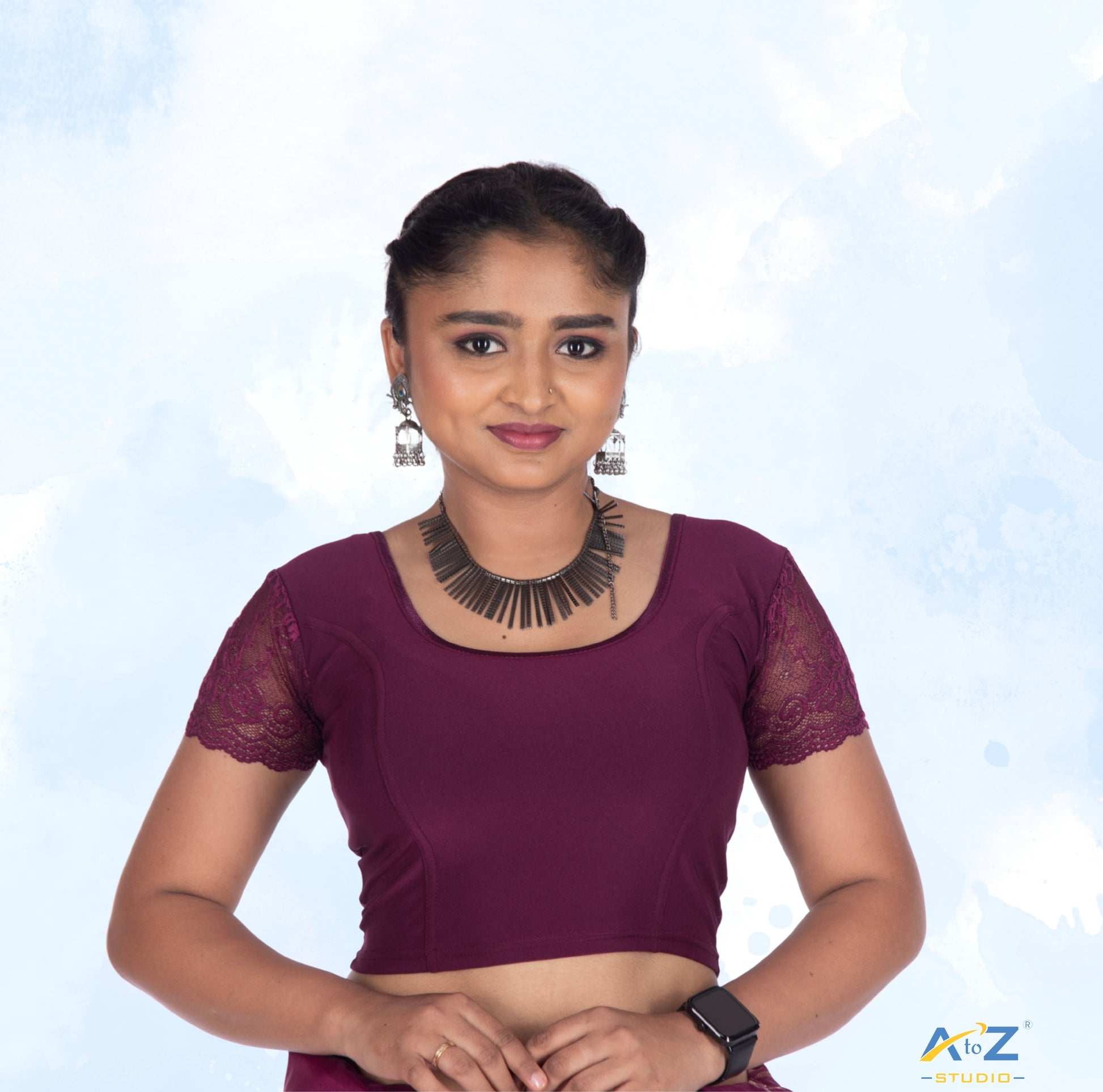 This Wine Polyester Lycra blouse offers net short sleeves, a round neck, and a stylish plain and flower print in the sleeves.