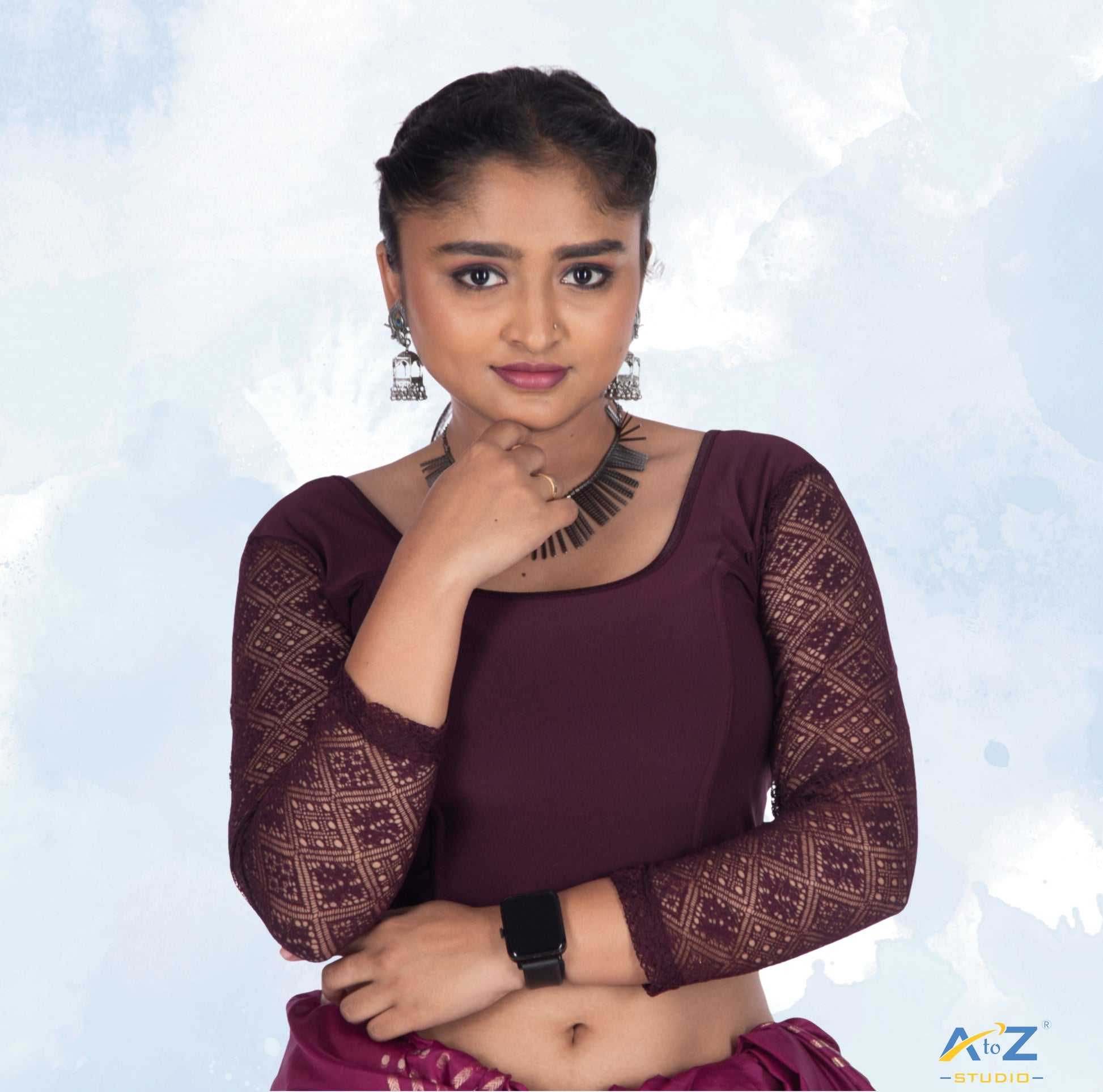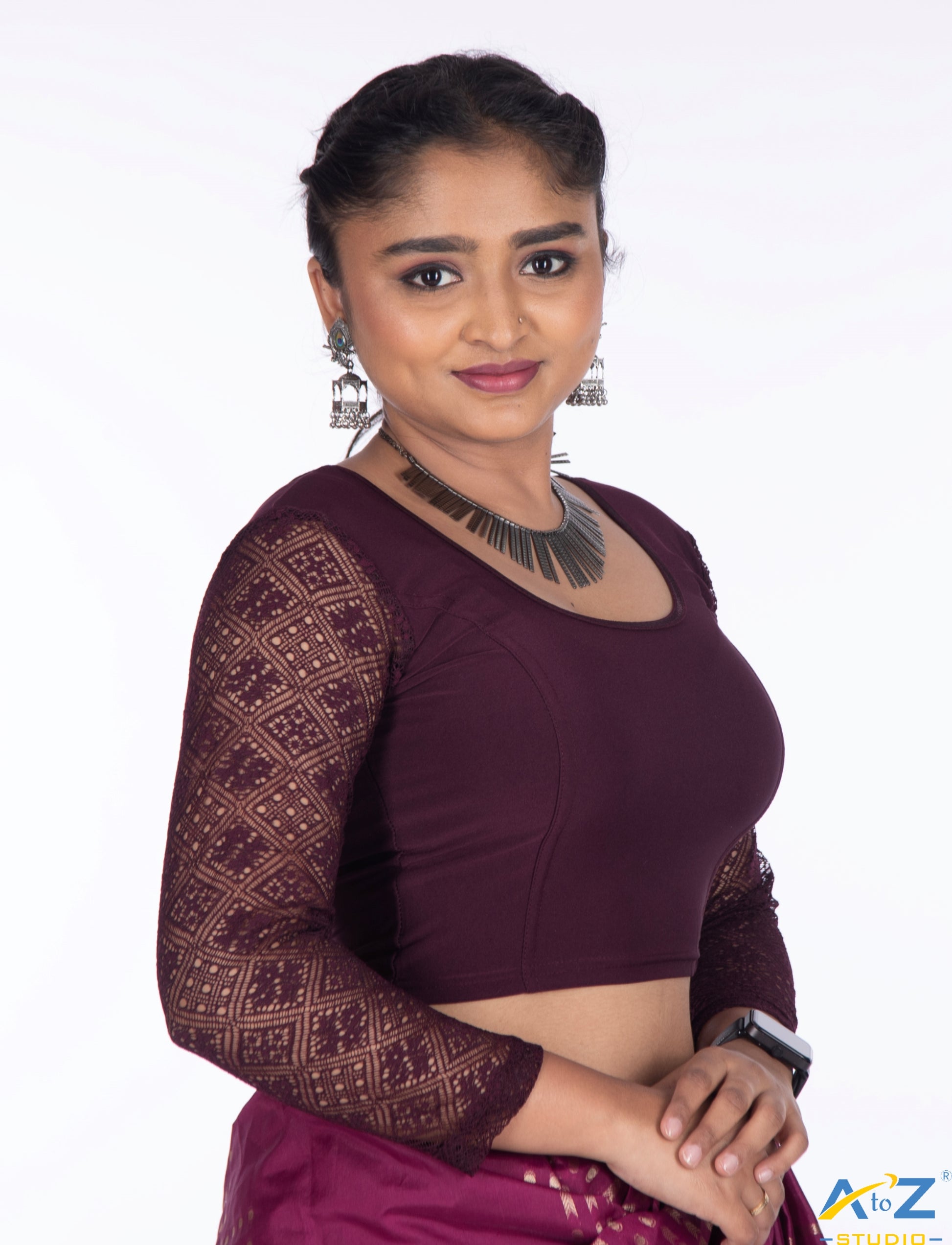 This Wine Polyester Lycra blouse features 3/4 net sleeves, a round neck, round back, and an effortlessly classic floral plain design on the sleeves.