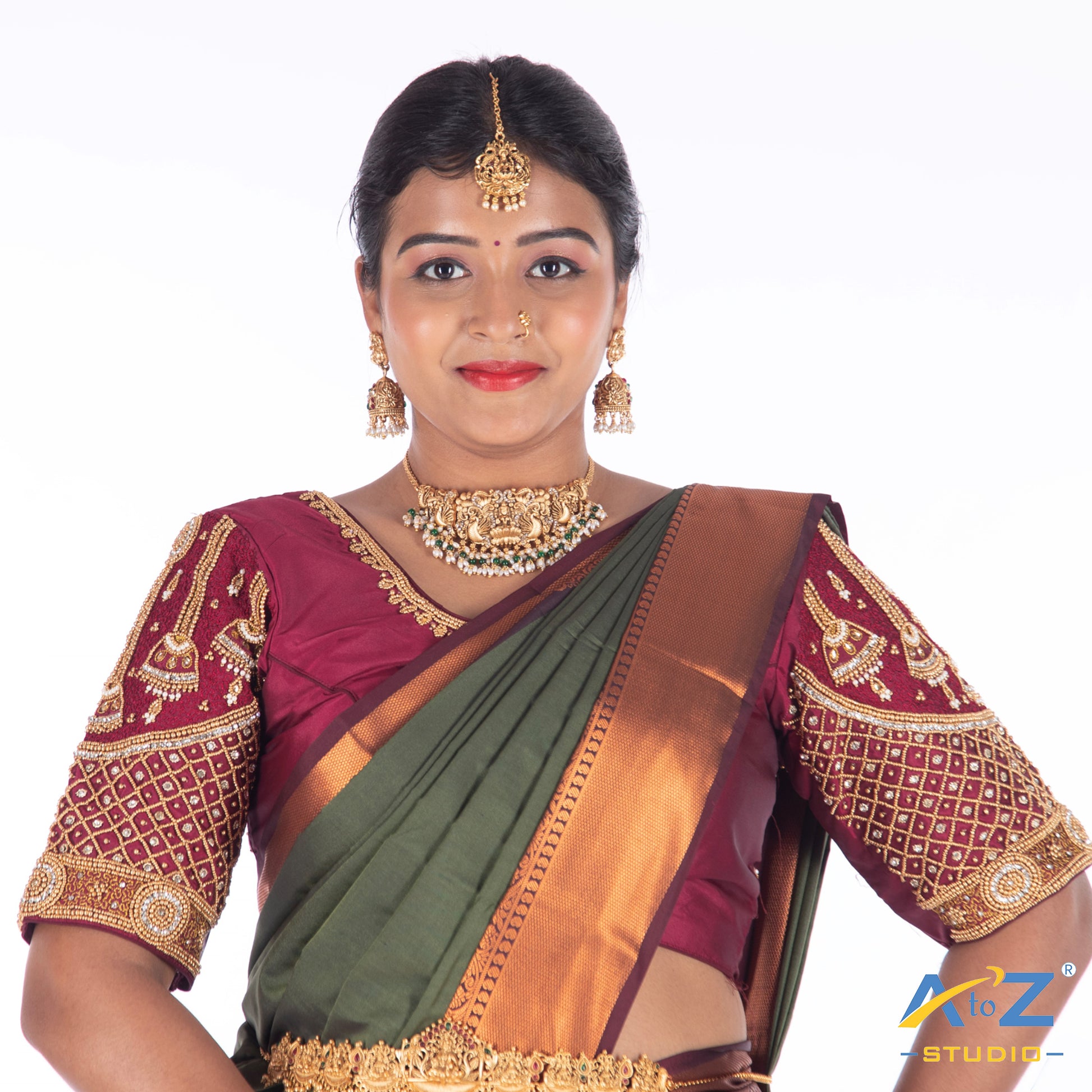 Elevate your style with this Silk Cloth blouse, featuring a stunning Aari work design and a chic Elbow Sleeves. Perfectly crafted in Wine, this blouse offers extra margins for a customizable fit and front hook closure.