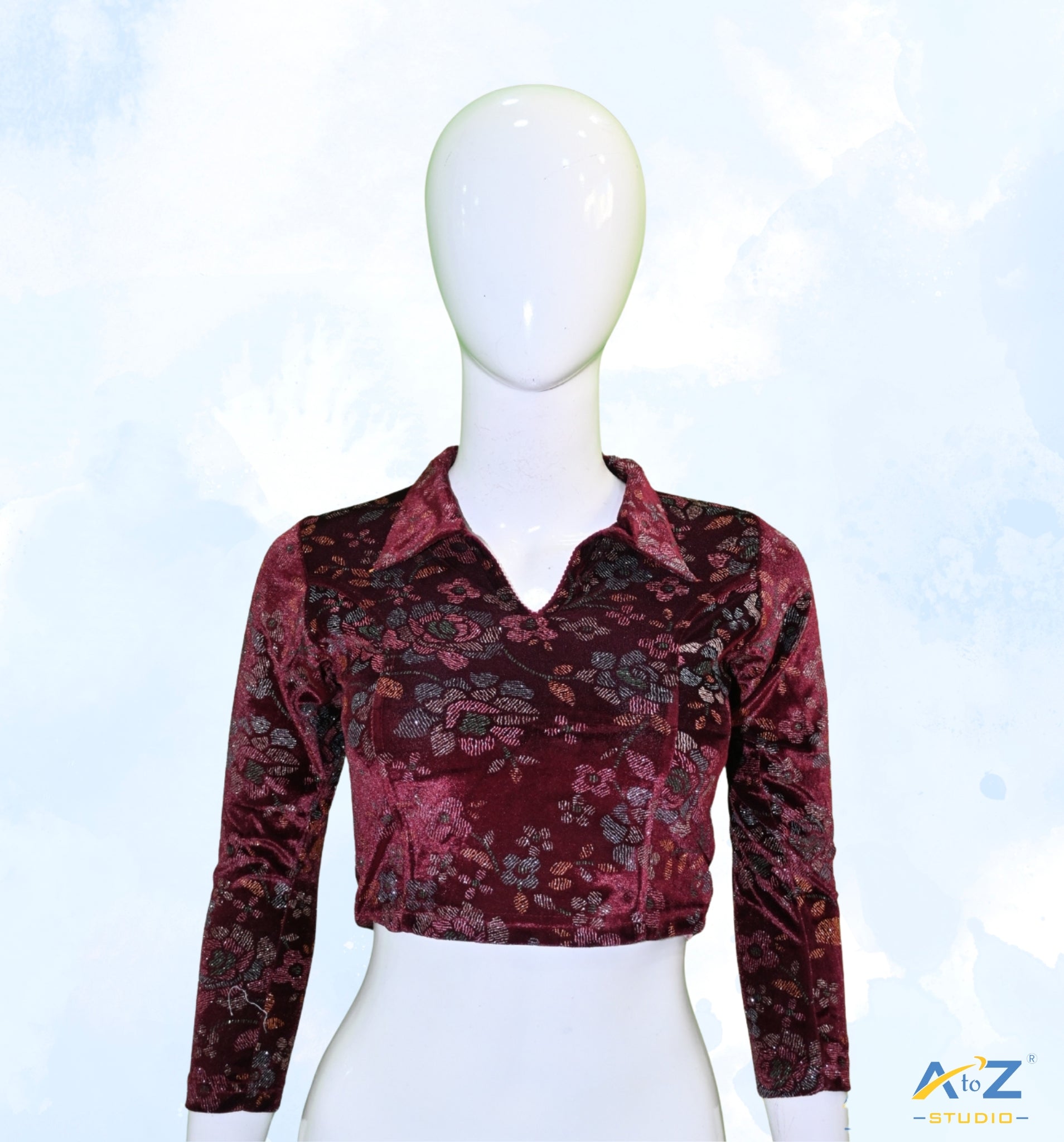 This elegant design features a classic collar neck in the front and a closed neck with a collar at the back, paired with stylish 3/4 sleeves. Made from soft, luxurious wine-colored velvet, it showcases beautiful flower pattern prints for a timeless and sophisticated look.