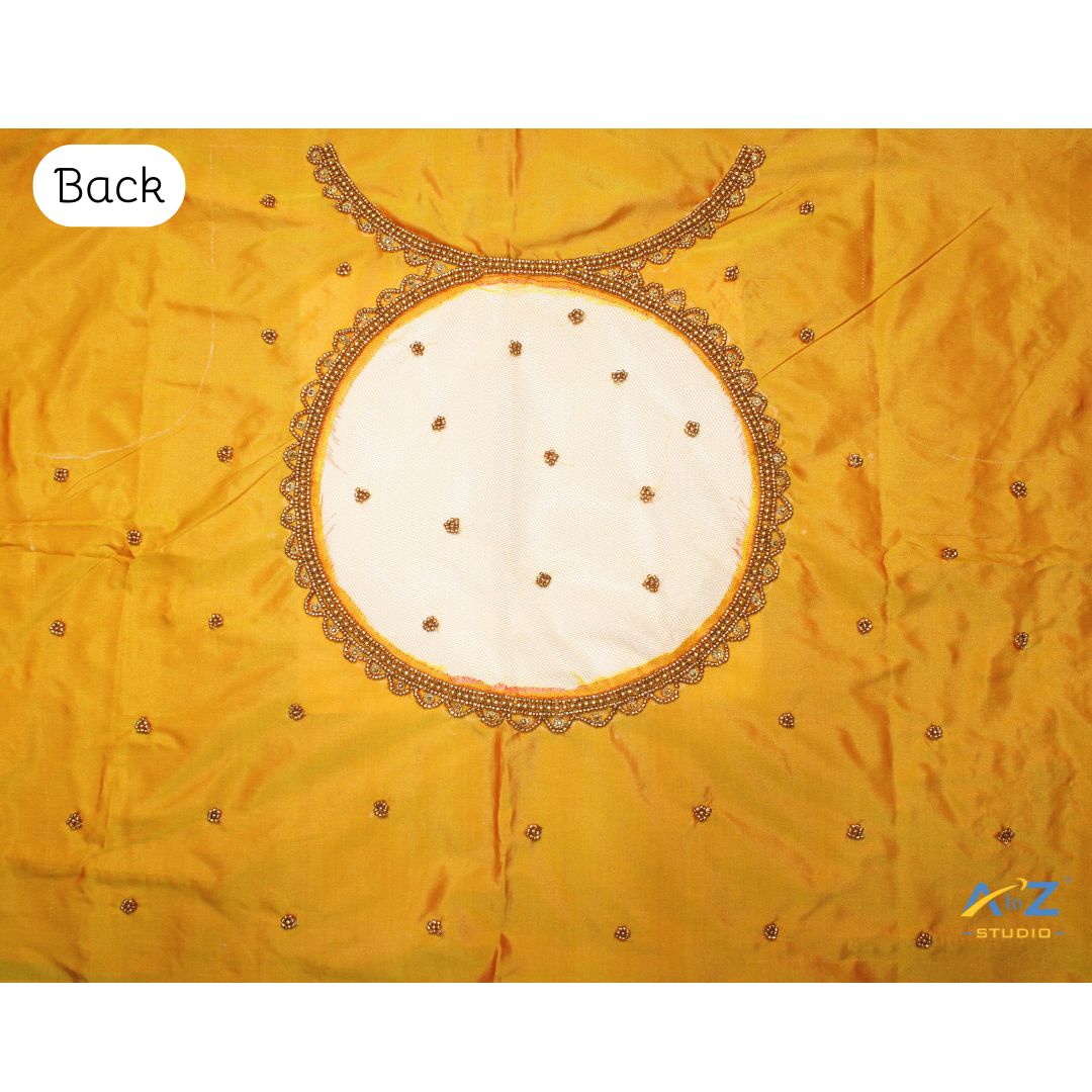 Experience the elegance of Yellow Mustard Silk blouse, crafted with premium 1.2 meter. Perfectly designed for sizes 36/38/40, featuring Aari work and a stunning Back Net Mix Aari simple design design.
