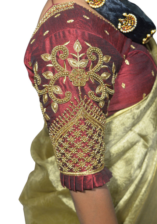 Maroon Blouse with Leaf Sleeves & Dual Embroidery