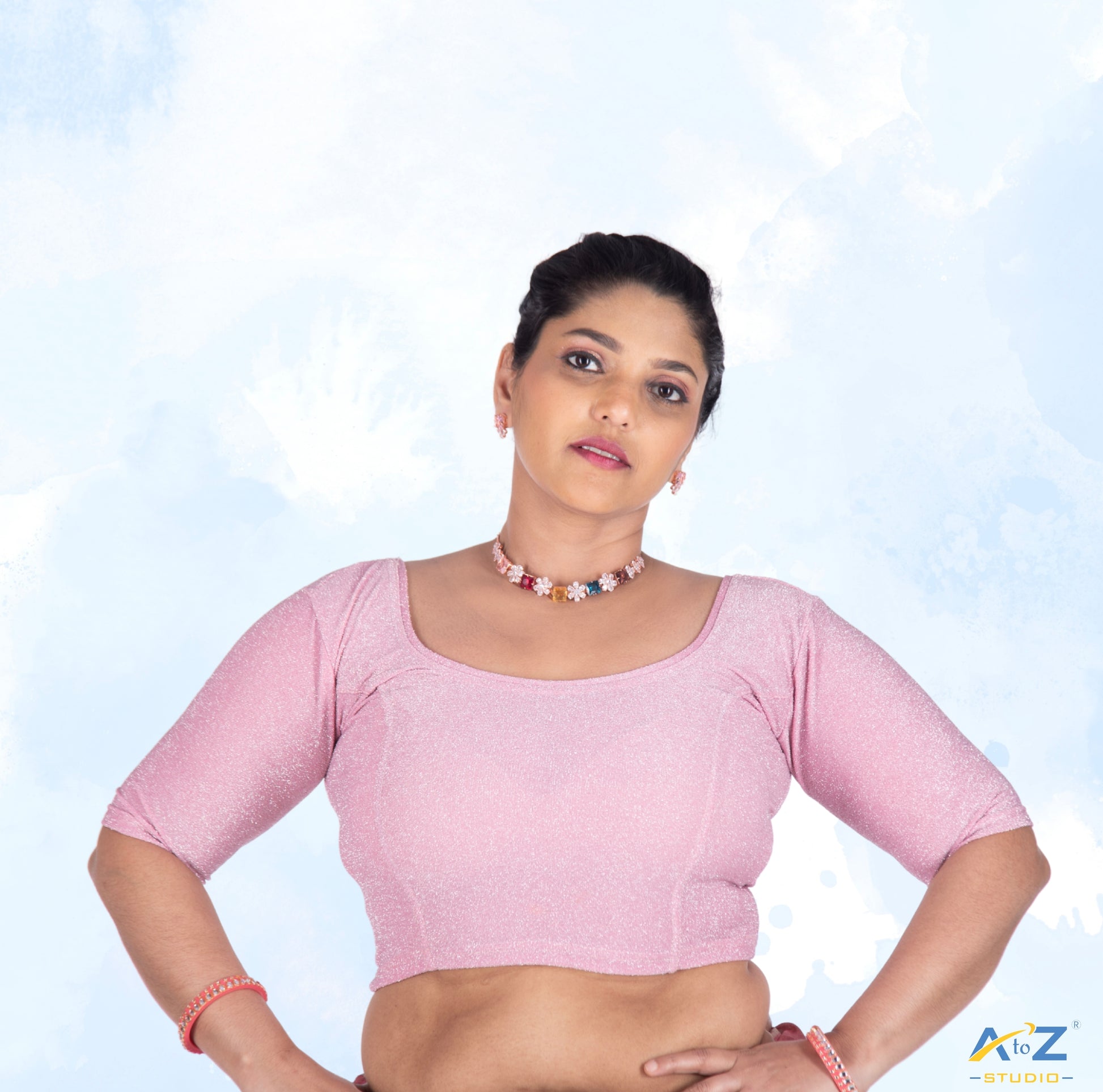 Baby Pink Metallic Lycra adds shine to this blouse with a round neck, round back, and elegant elbow sleeves.