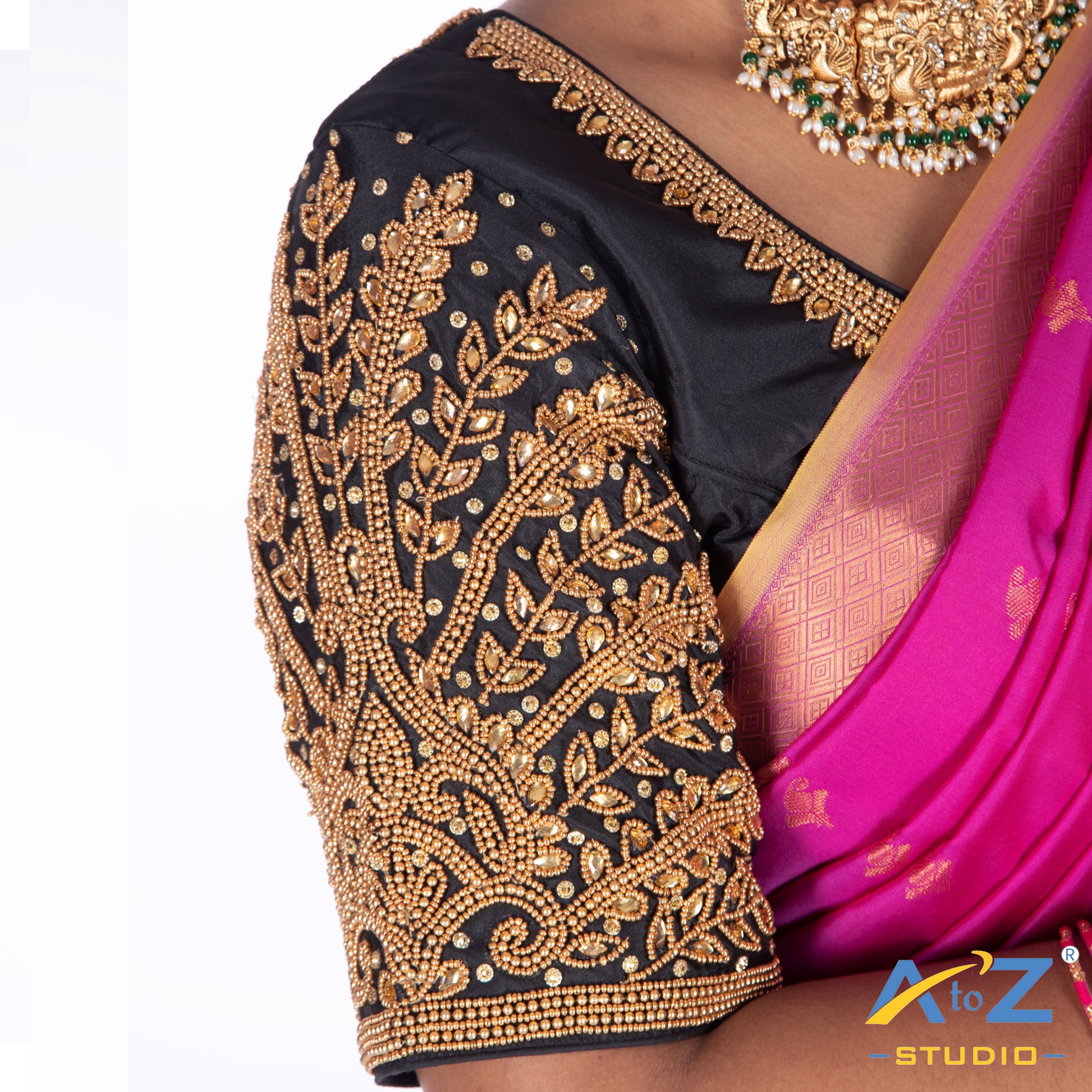 Elevate your style with this Silk Cloth blouse, featuring a stunning Aari Work design and a chic Elbow Sleeves. Perfectly crafted in Black, this blouse offers extra margins for a customizable fit and front hook closure.