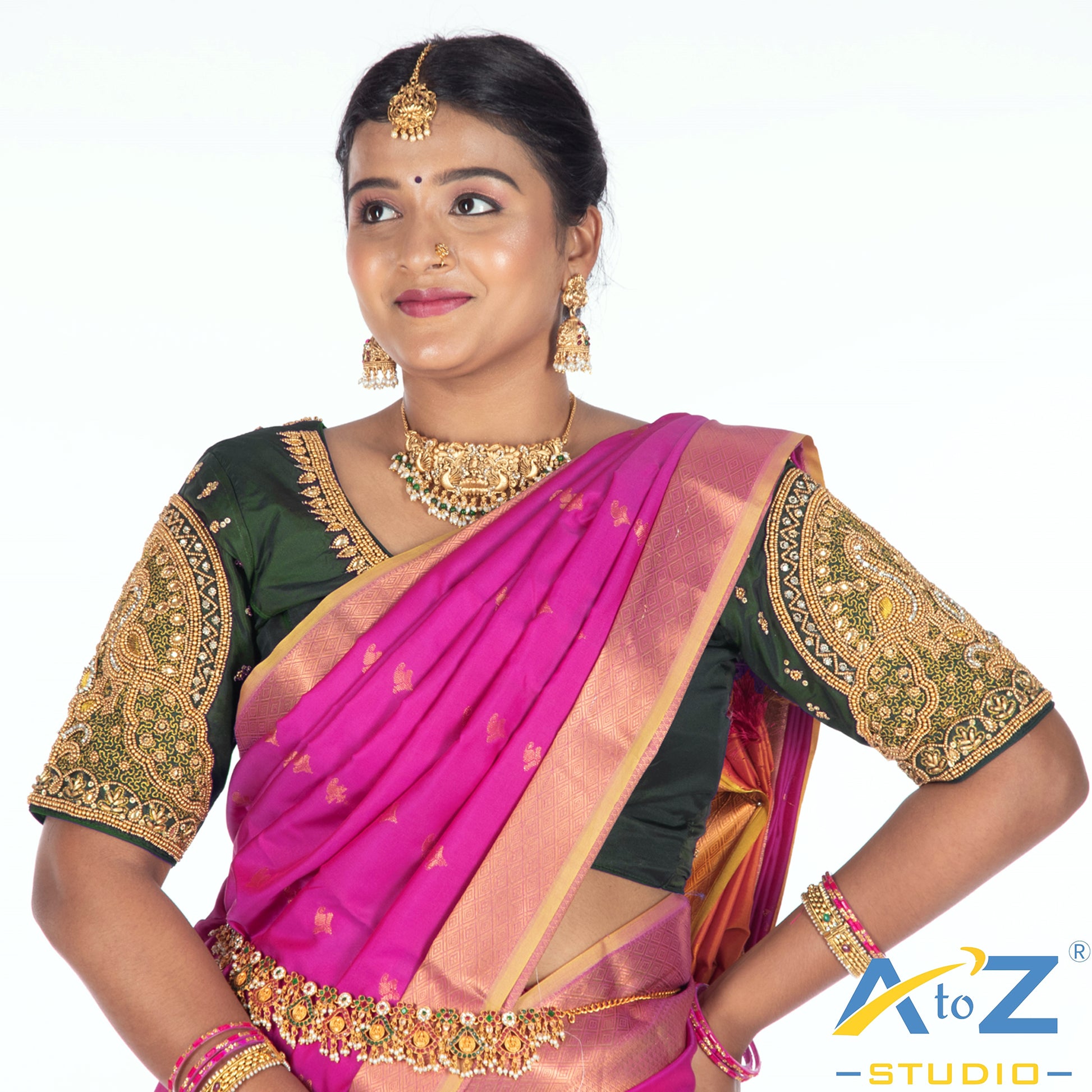 Elevate your style with this Silk Cloth blouse, featuring a stunning Aari Work design and a chic Elbow Sleeves. Perfectly crafted in Bottle Green, this blouse offers extra margins for a customizable fit and front hook closure.