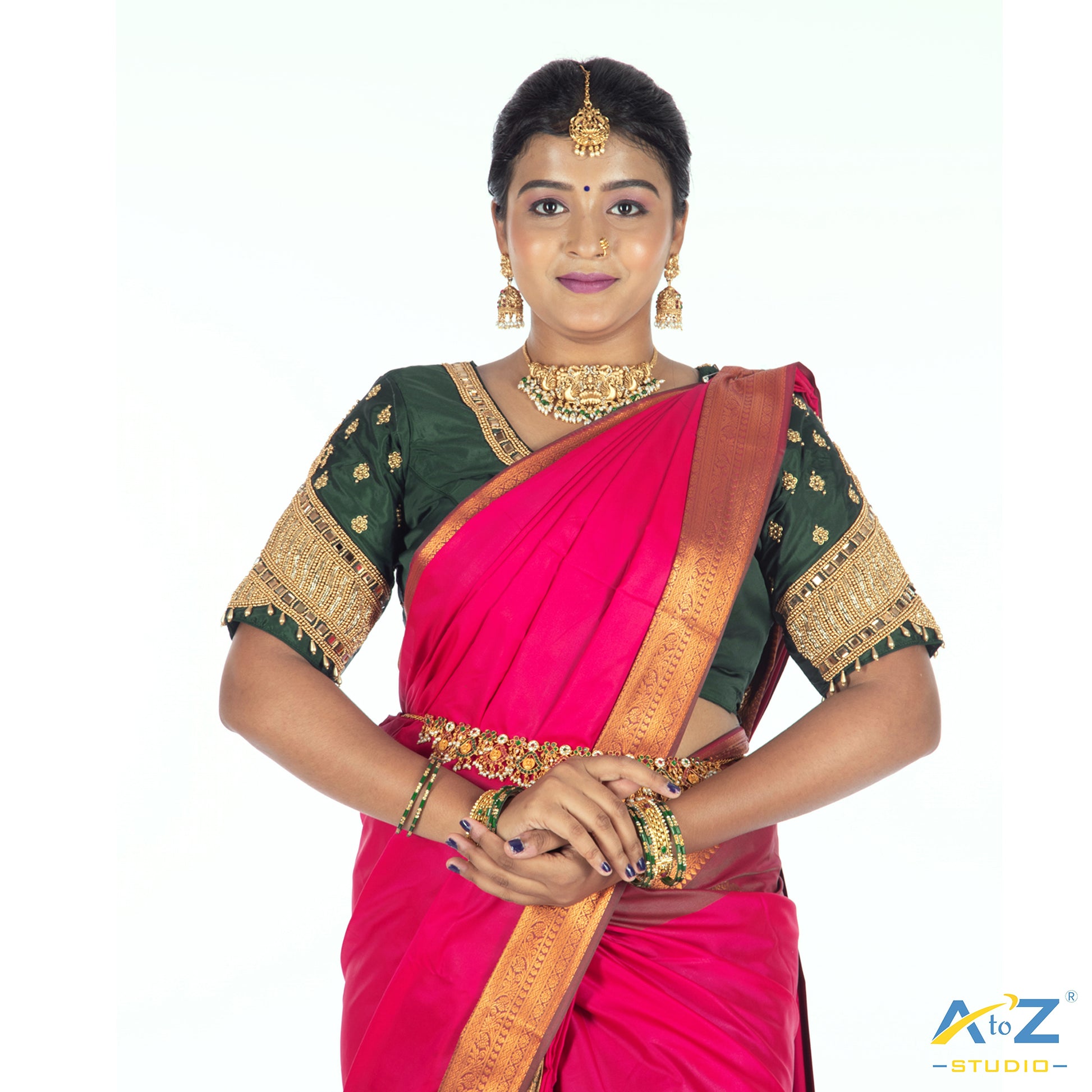 Elevate your style with this Silk Cloth blouse, featuring a stunning Aari Work design and a chic Elbow Sleeves. Perfectly crafted in Bottle Green, this blouse offers extra margins for a customizable fit and front hook closure.