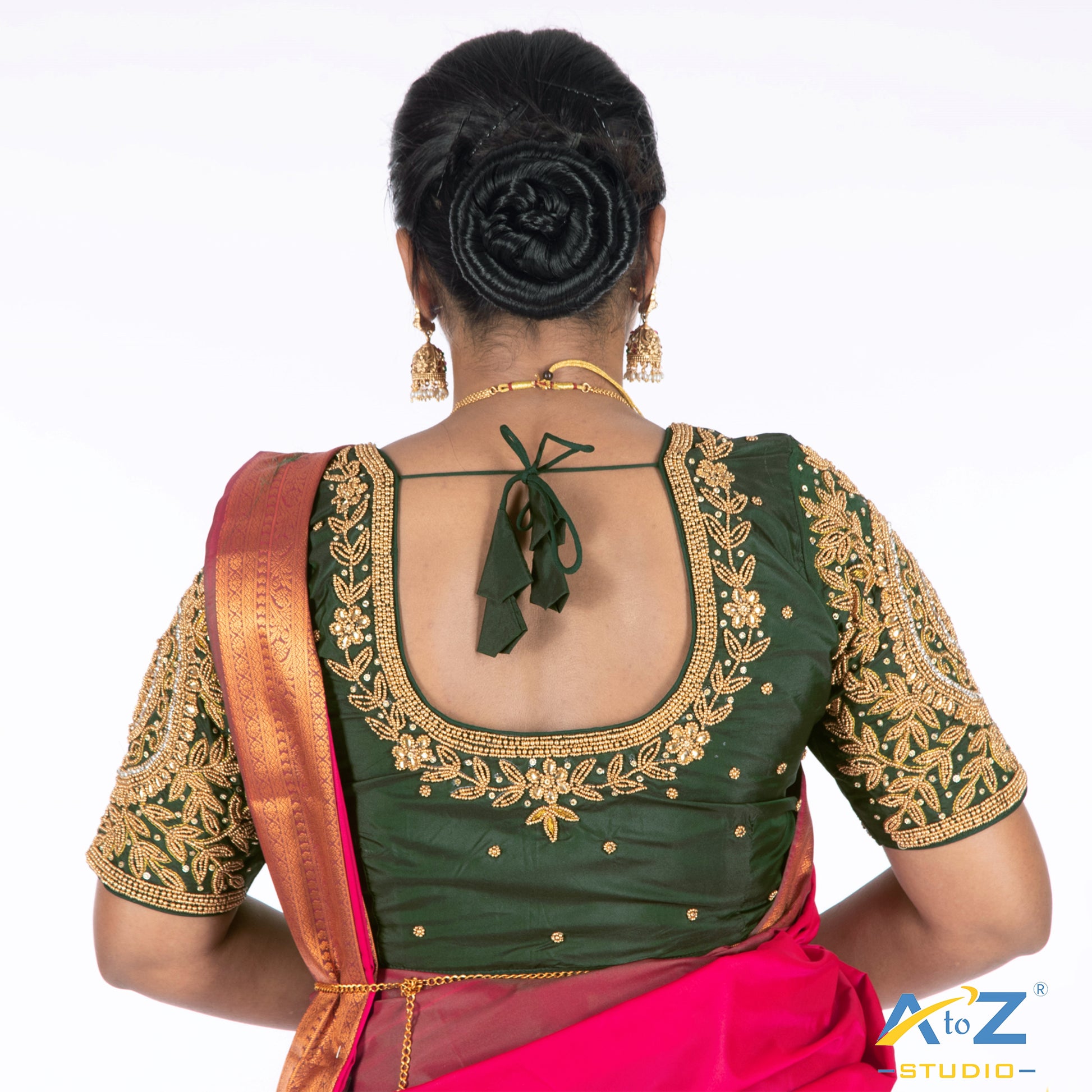 Elevate your style with this Tissue Cloth/Gold Work blouse, featuring a stunning Aari Work design and a chic Elbow Sleeves. Perfectly crafted in Bottle Green, this blouse offers extra margins for a customizable fit and front hook closure.