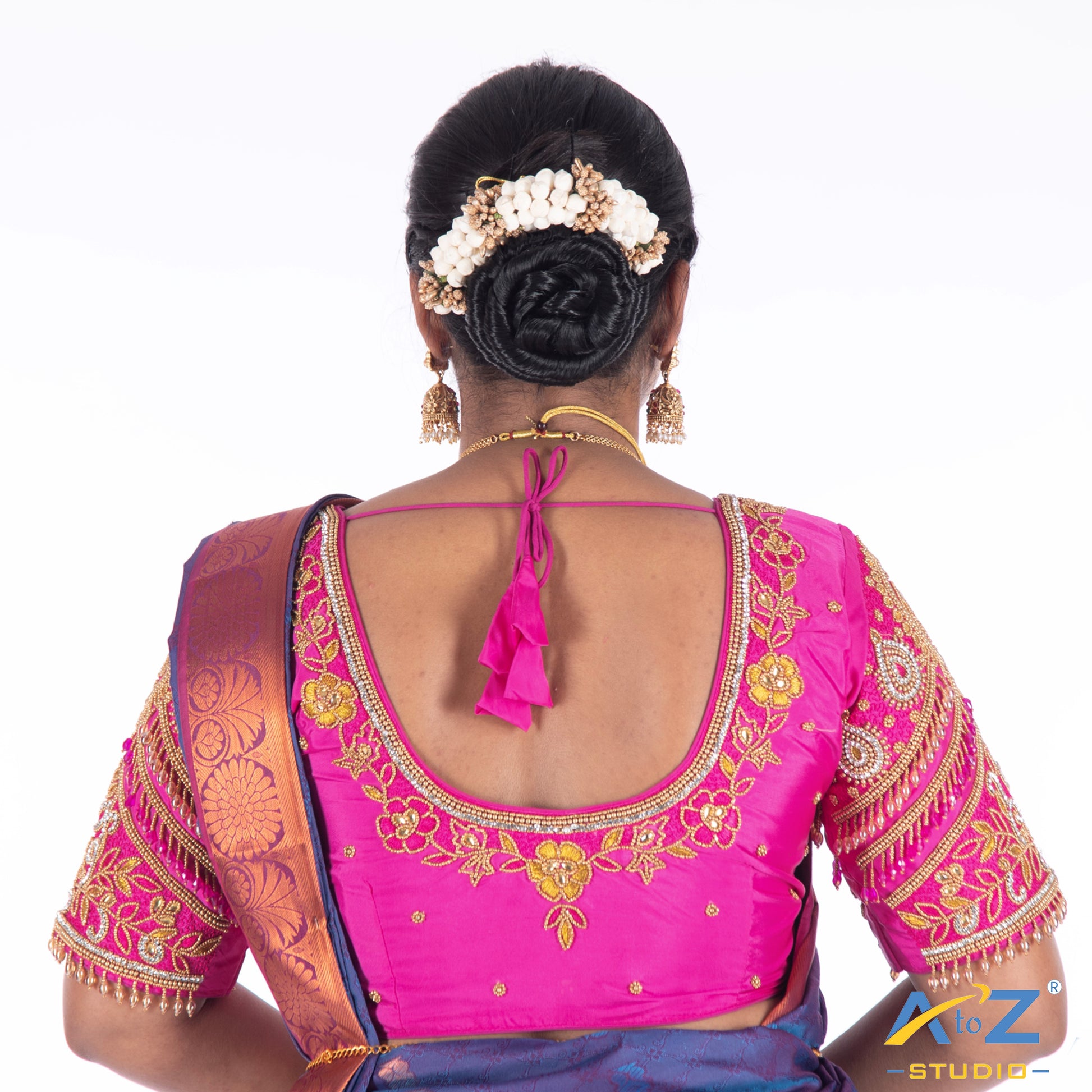 Elevate your style with this Silk Cloth blouse, featuring a stunning Aari work design and a chic Elbow Sleeves. Perfectly crafted in Bright Pink, this blouse offers extra margins for a customizable fit and front hook closure.