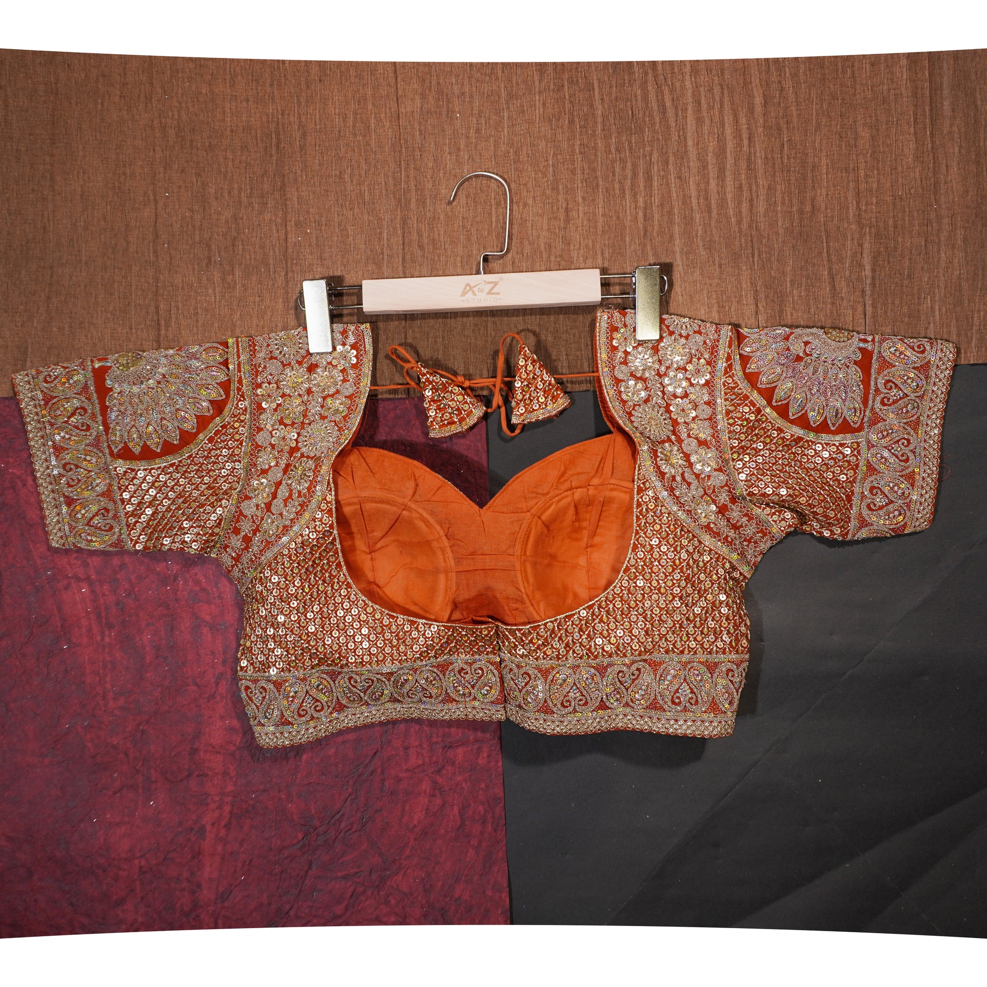 Warm orange blouse with detailed zari and sequin artistry.