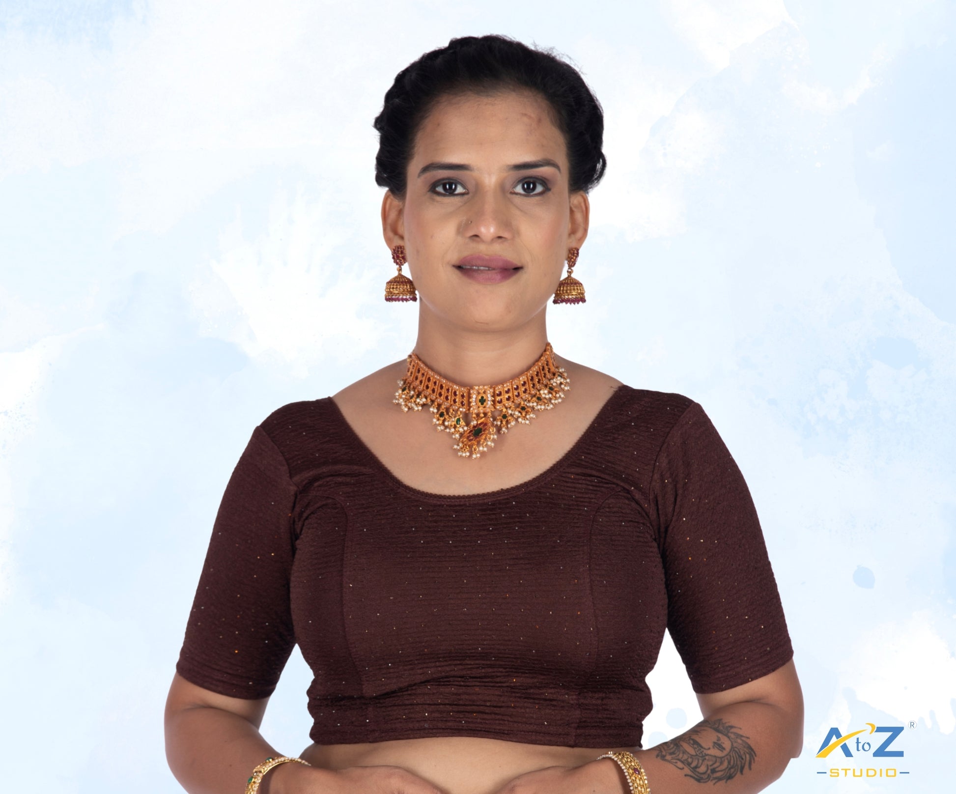 The Coffee Crush Fabric Blouse combines elegance and style with a round neck, round back, trendy elbow sleeves, and a detailed tissue design with stone work.