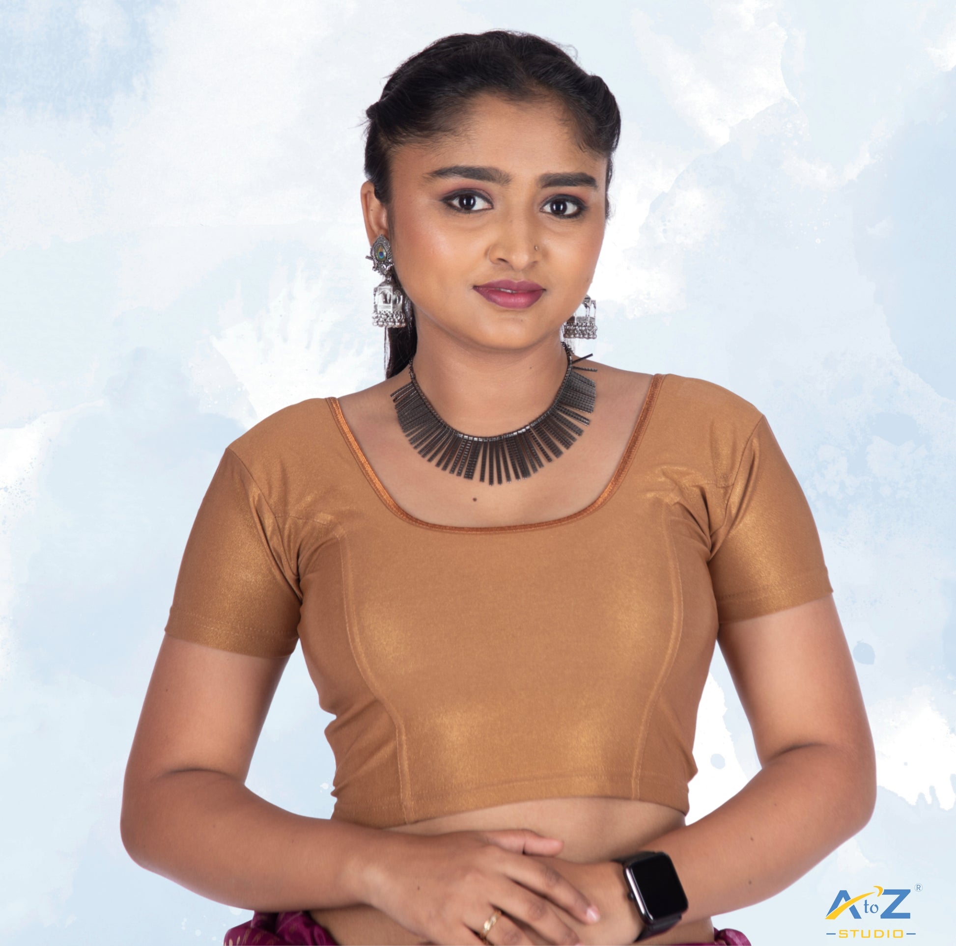 This Copper Lycra Shimmer blouse features short sleeves, a round neck, and plain shiny design, offering a sleek finish.