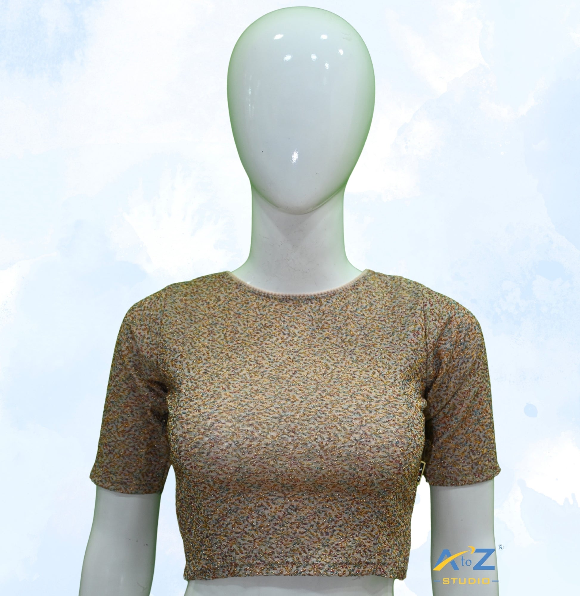 This cream metallic lycra blouse offers elbow sleeves, a boat neck, a back hole (2.2-inch length with hem at back), and a metallic jacquard design. Sleek and trendy.