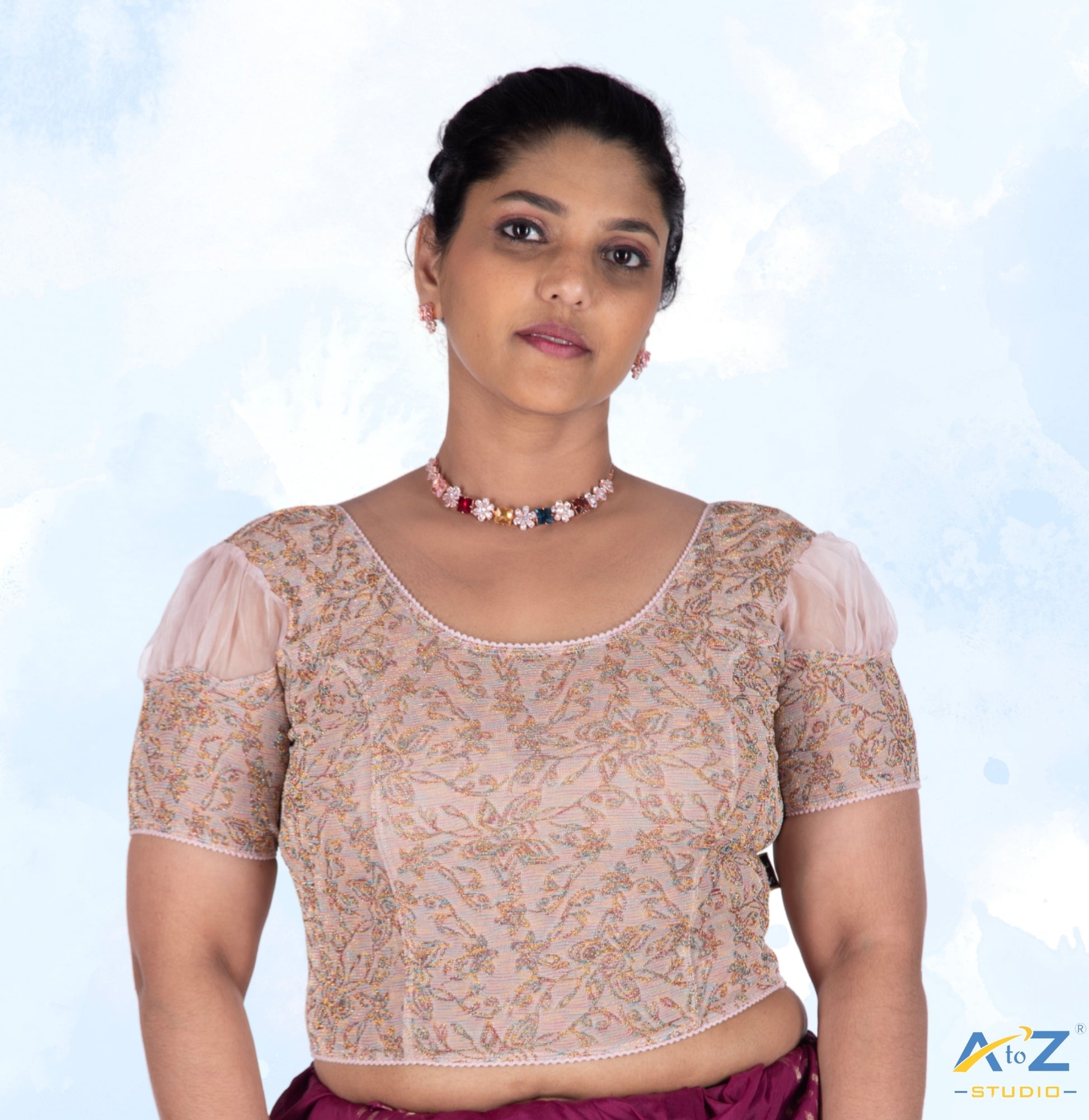 This cream metallic lycra blouse combines puff organza net short sleeves, a 6.5-inch round neck, and a metallic jacquard design. Elegant and chic.