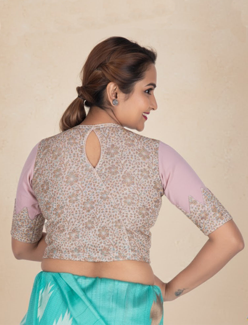 Cream Tissue Lycra half/patch net sleeves with a boat neck and close neck back hole design (4 inches). Multi-color jeri design makes it versatile and stylish.
