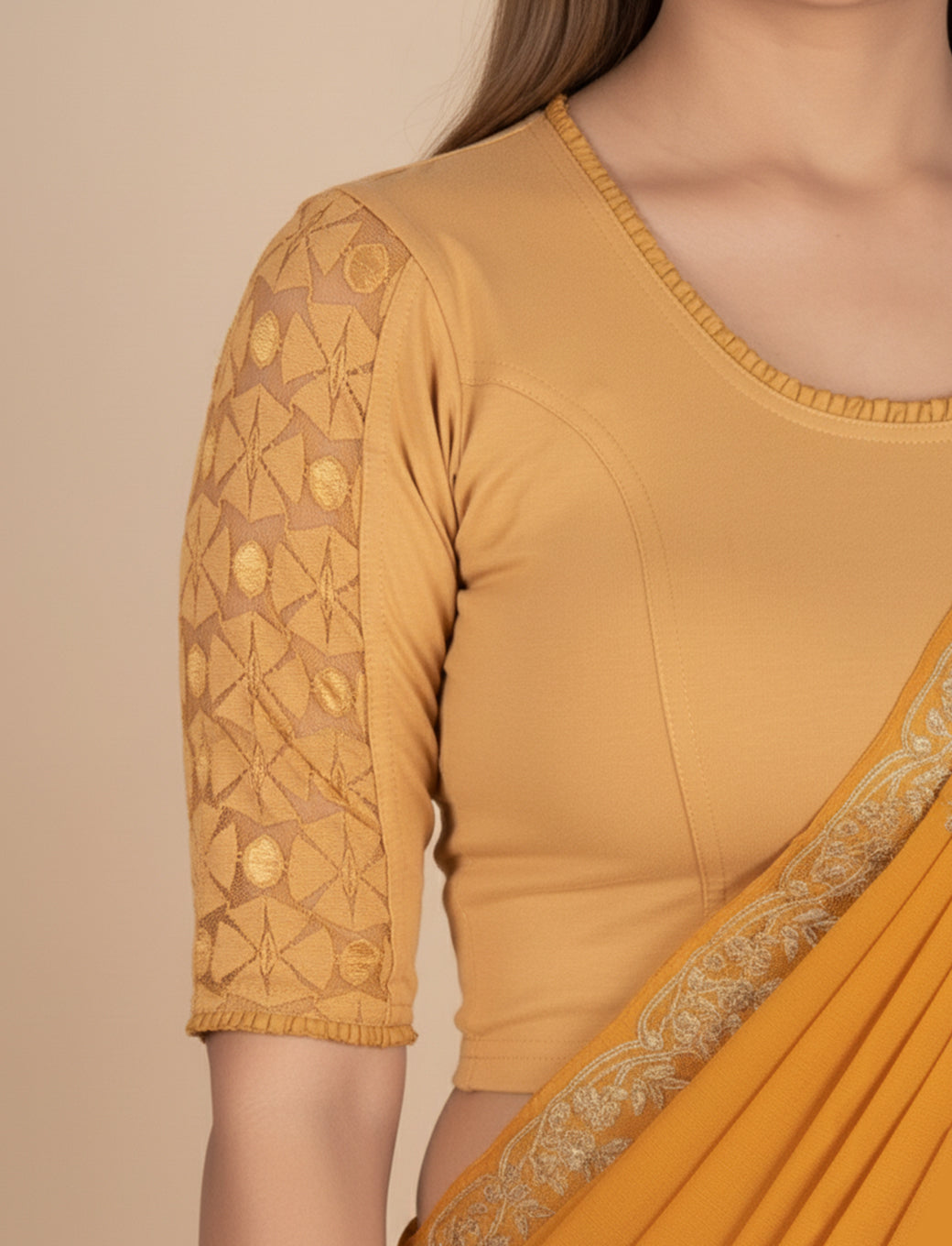 This elegant design features a round neck in the front and a round back neckline, paired with stylish elbow sleeves. Made from soft cotton lycra in a beautiful dark chiku color, it showcases a net flower print on the back for a unique and chic style.