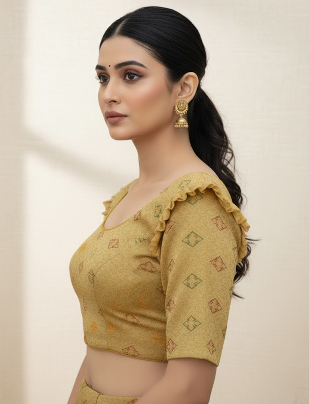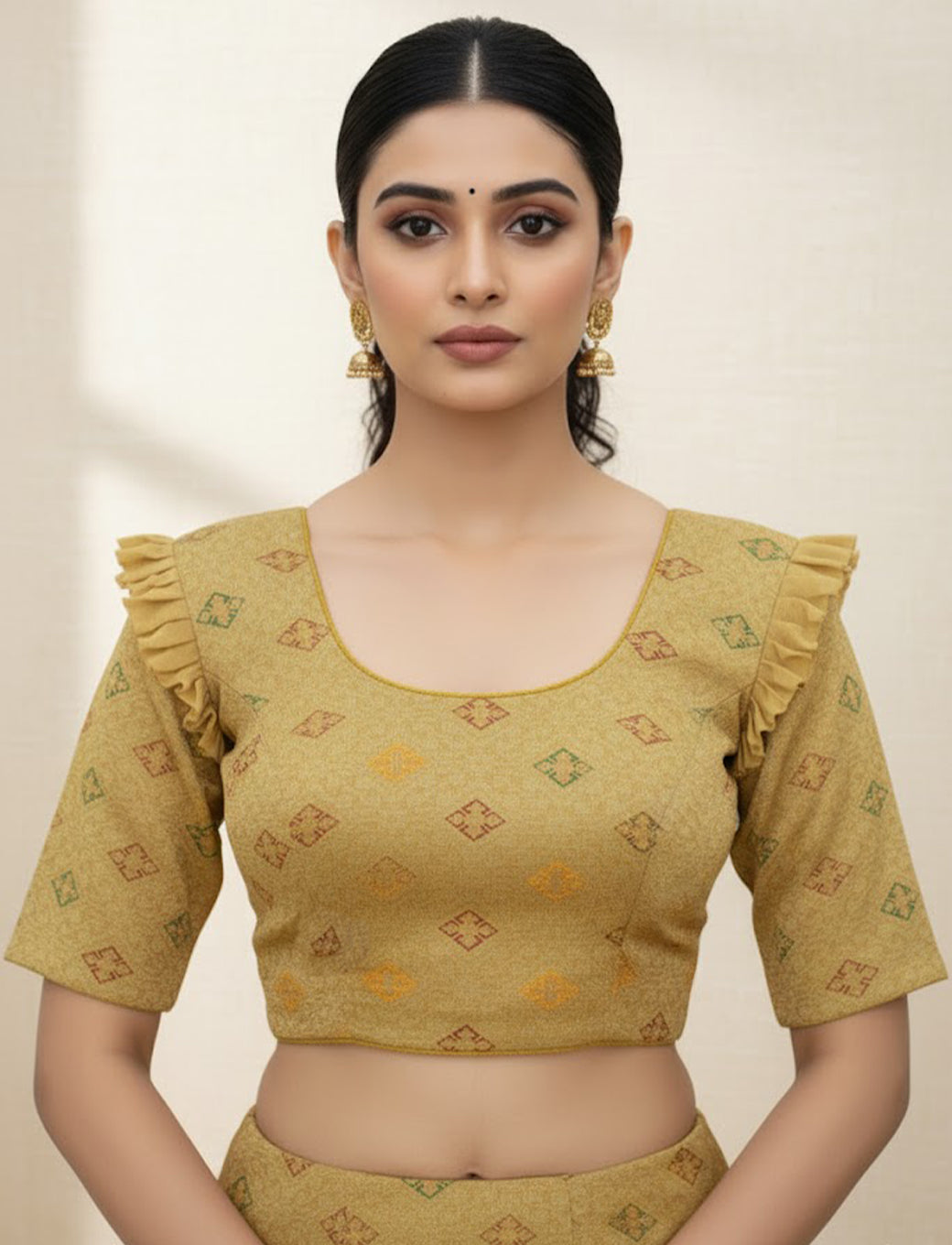 Elevate your style with this Dark Chiku Crush Fabric Blouse, featuring an elegant Round Neck Front and Round Neck Back with a Belt and Bow Detail. The Elbow Sleeves and kite print design add a unique and versatile touch to any occasion.