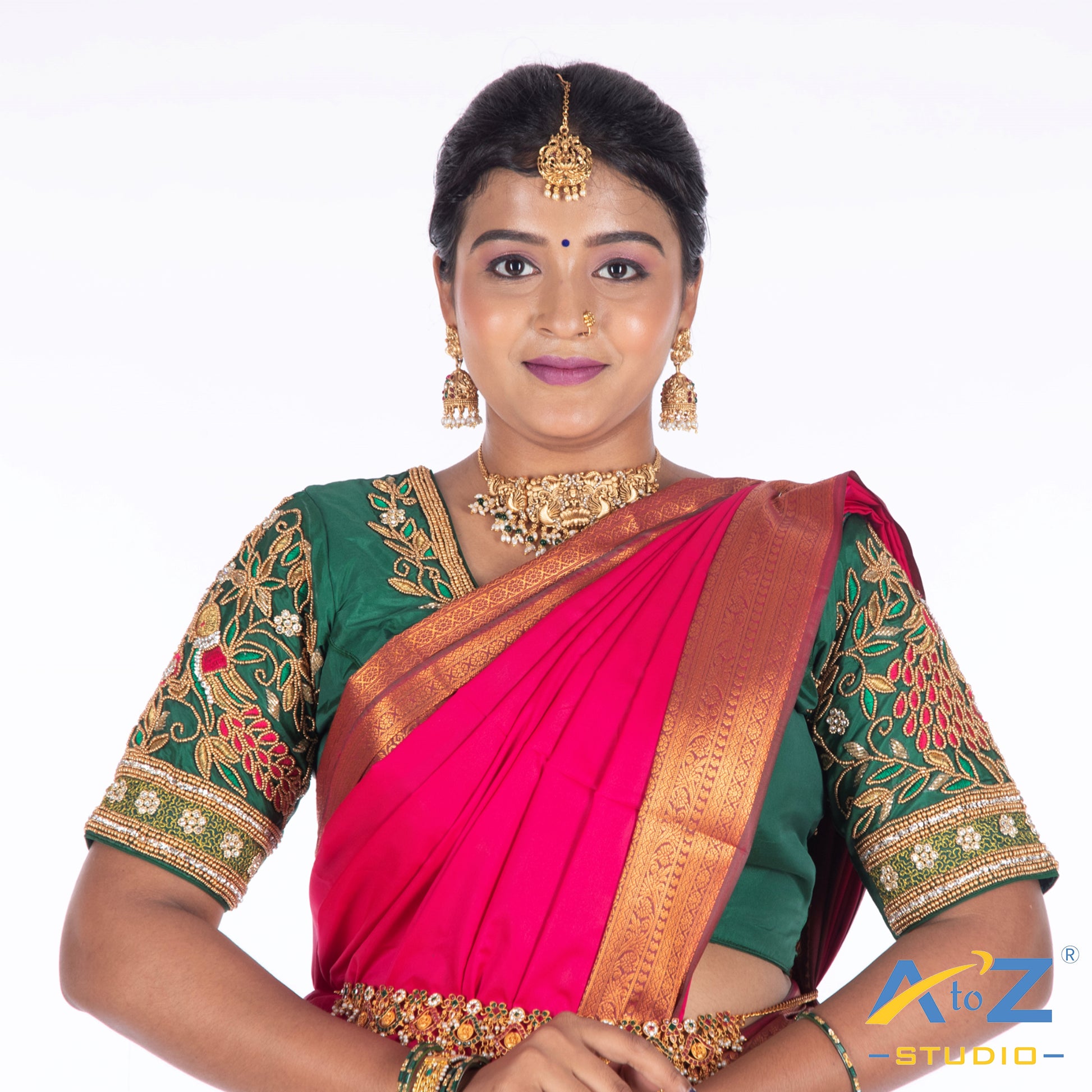 Elevate your style with this Silk Cloth blouse, featuring a stunning Aari Work design and a chic Elbow Sleeves. Perfectly crafted in Dark Green, this blouse offers extra margins for a customizable fit and front hook closure.