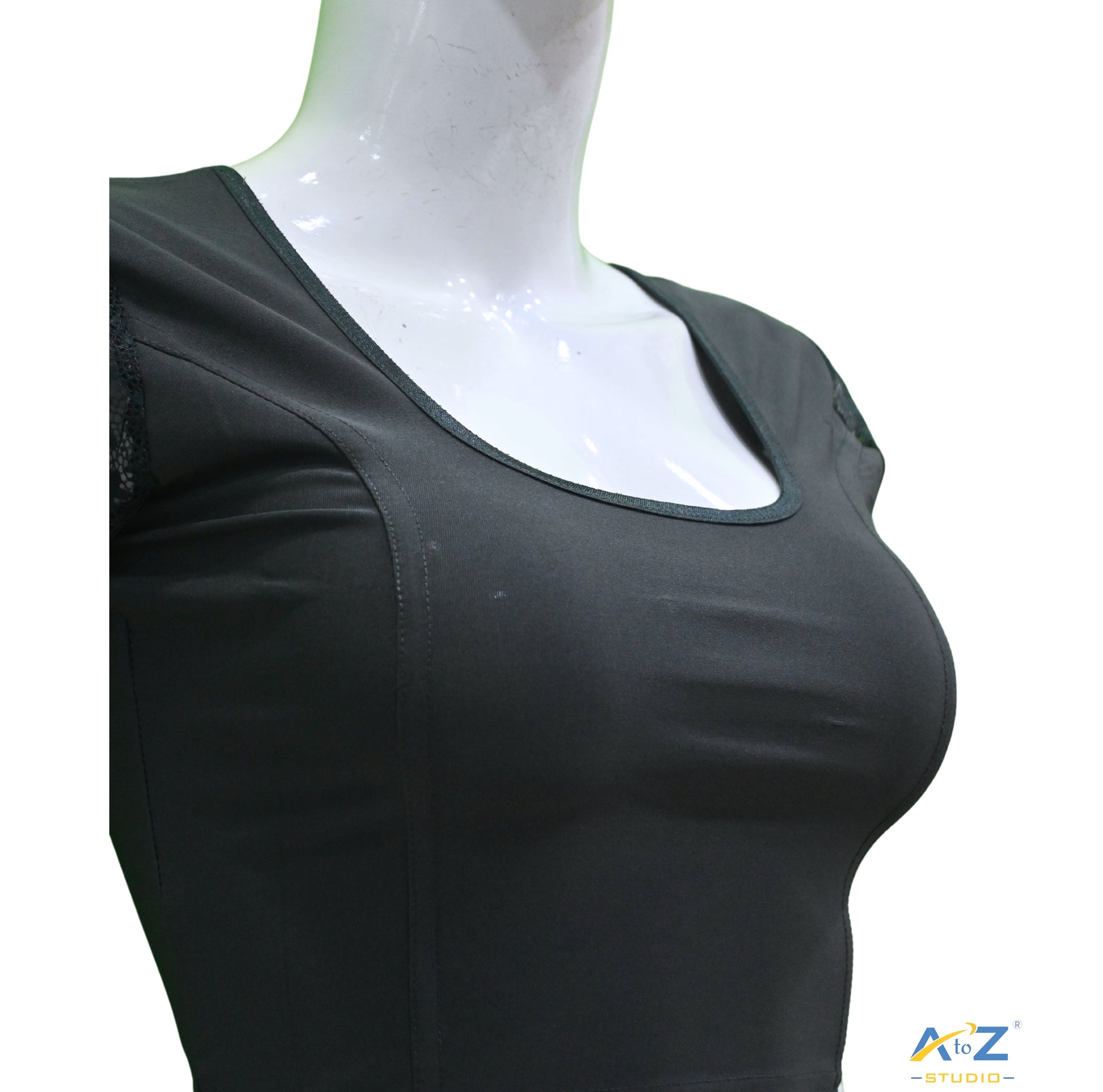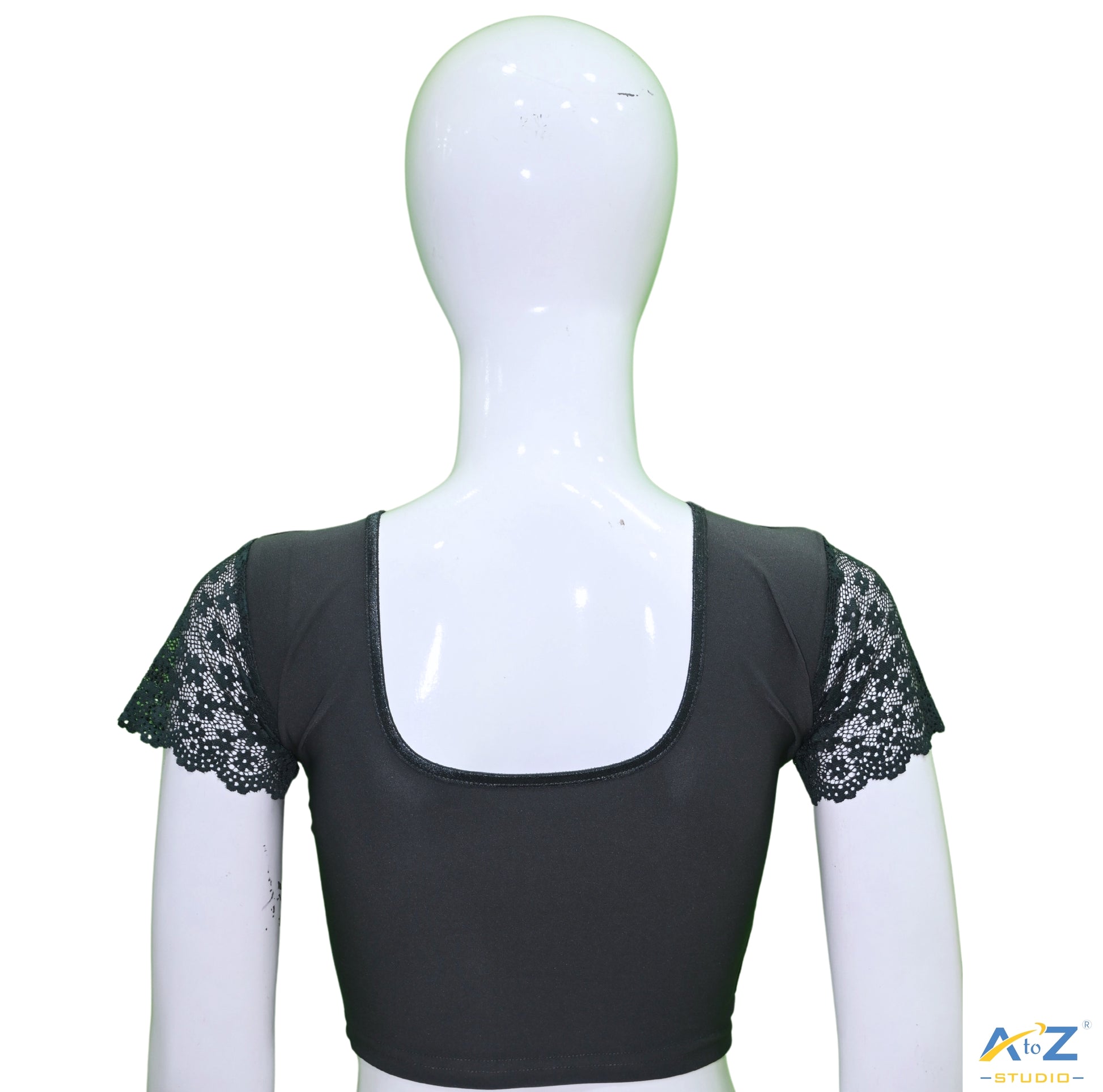 This Dark Grey Polyester Lycra blouse with net short sleeves, round neck, and a plain and flower print in the sleeves adds a touch of sophistication.