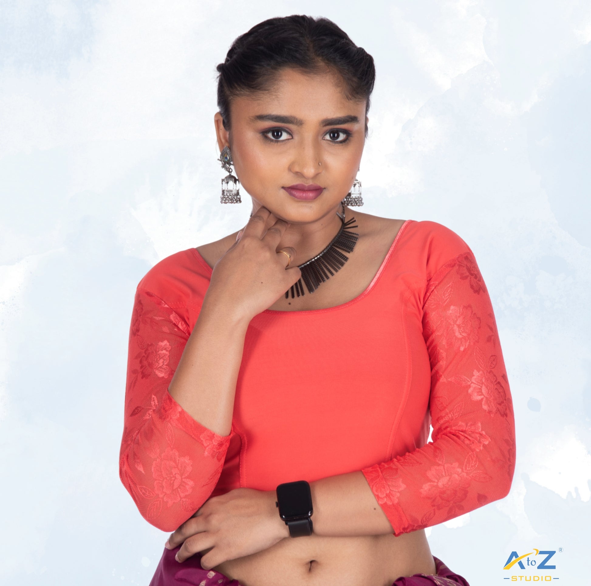 Dark Peach Polyester Lycra has been styled into this blouse with 3/4 net sleeves, a round neck, round back, and a classic floral plain design on the sleeves.