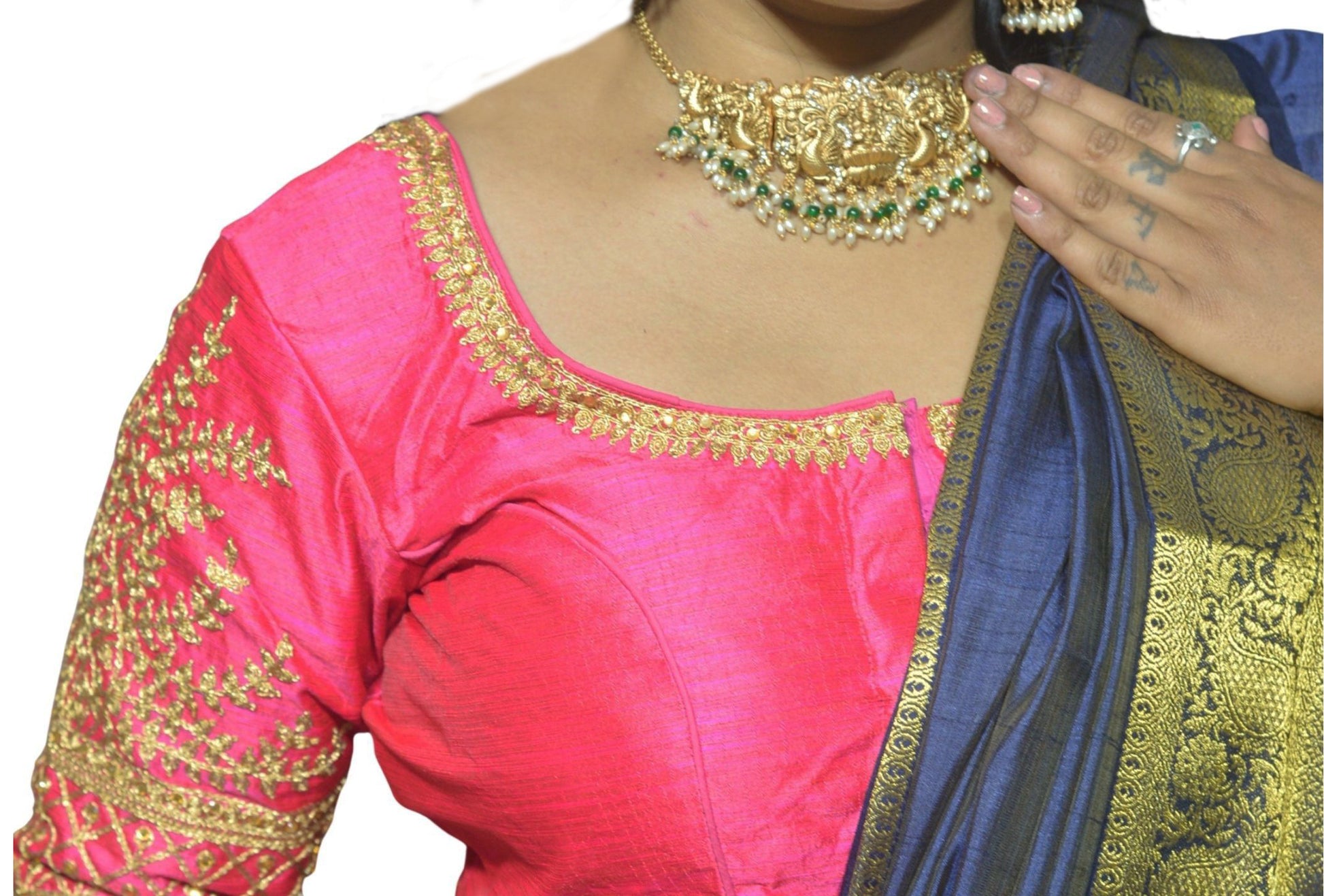 Stylish Fuchsia blouse featuring cross plus and puff detailing on the sleeves, paired with intricate machine embroidery on the front and back. A modern ethnic piece ideal for festive and semi-formal occasions