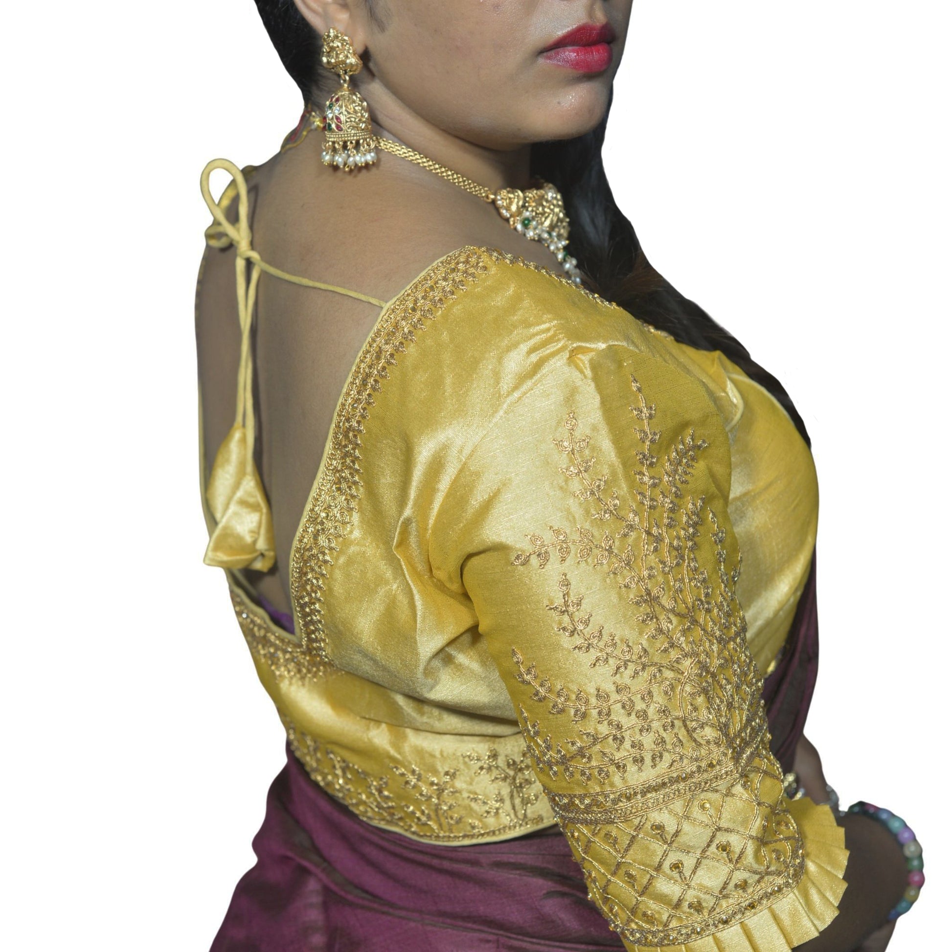 Stylish Gold blouse featuring cross plus and puff detailing on the sleeves, paired with intricate machine embroidery on the front and back. A modern ethnic piece ideal for festive and semi-formal occasions