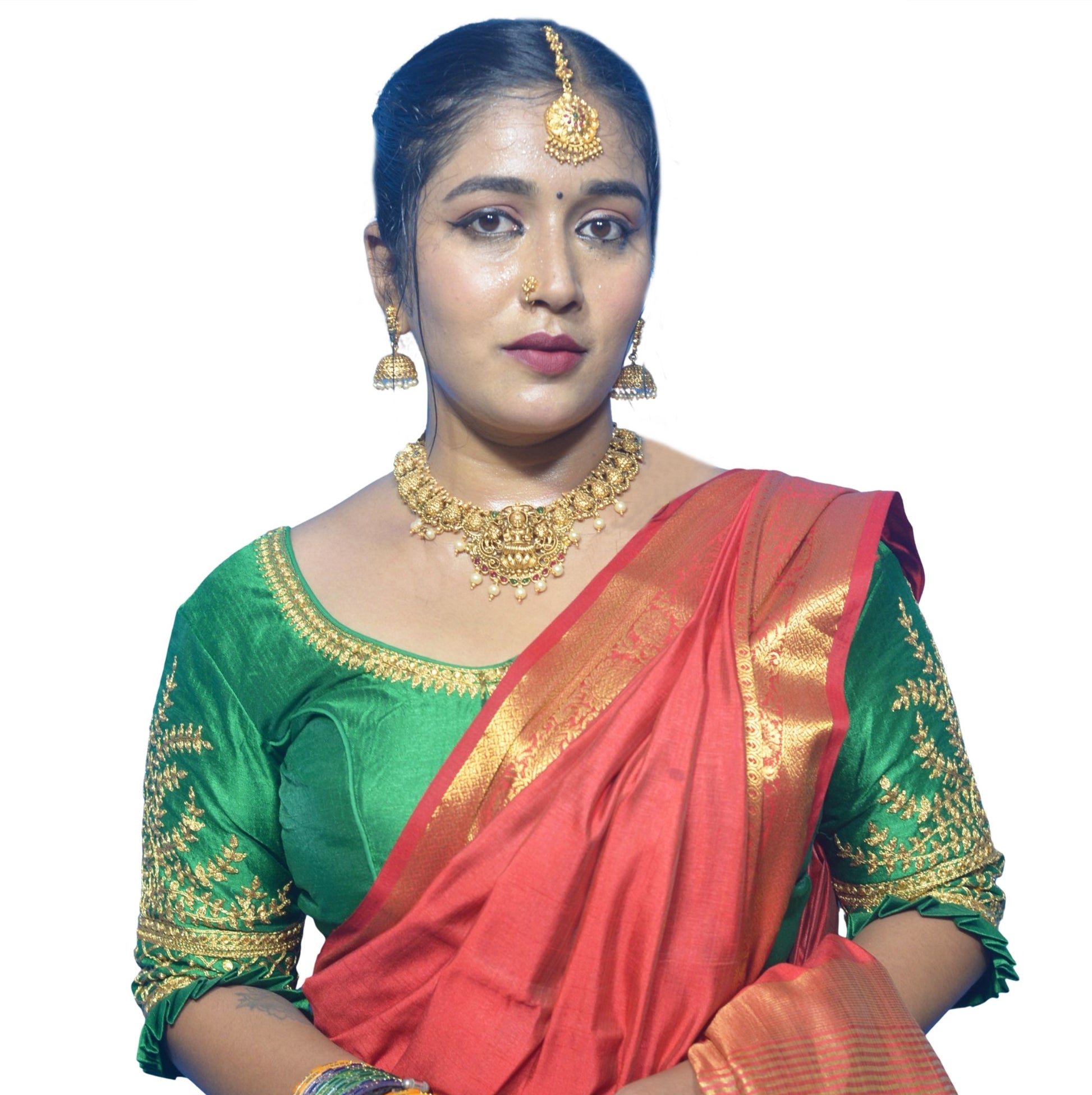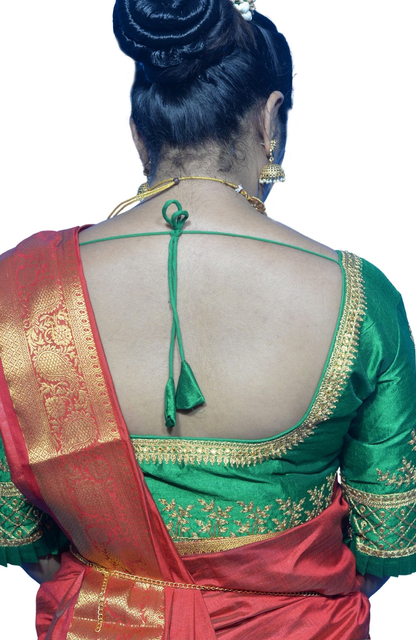 Stylish Green blouse featuring cross plus and puff detailing on the sleeves, paired with intricate machine embroidery on the front and back. A modern ethnic piece ideal for festive and semi-formal occasions