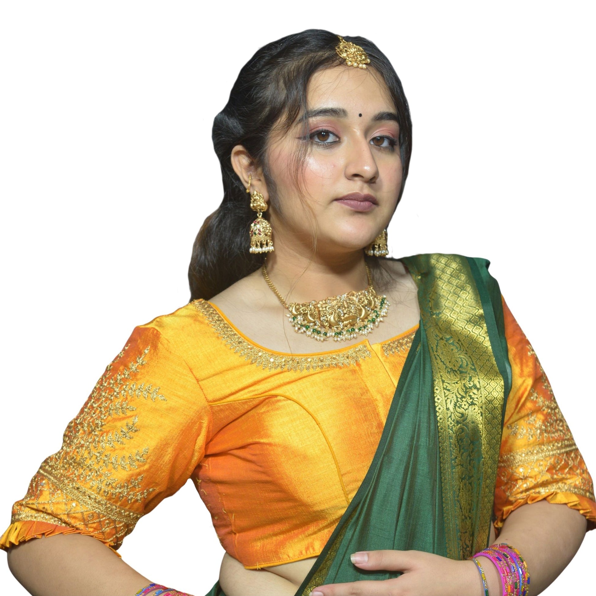 Stylish Mango blouse featuring cross plus and puff detailing on the sleeves, paired with intricate machine embroidery on the front and back. A modern ethnic piece ideal for festive and semi-formal occasions