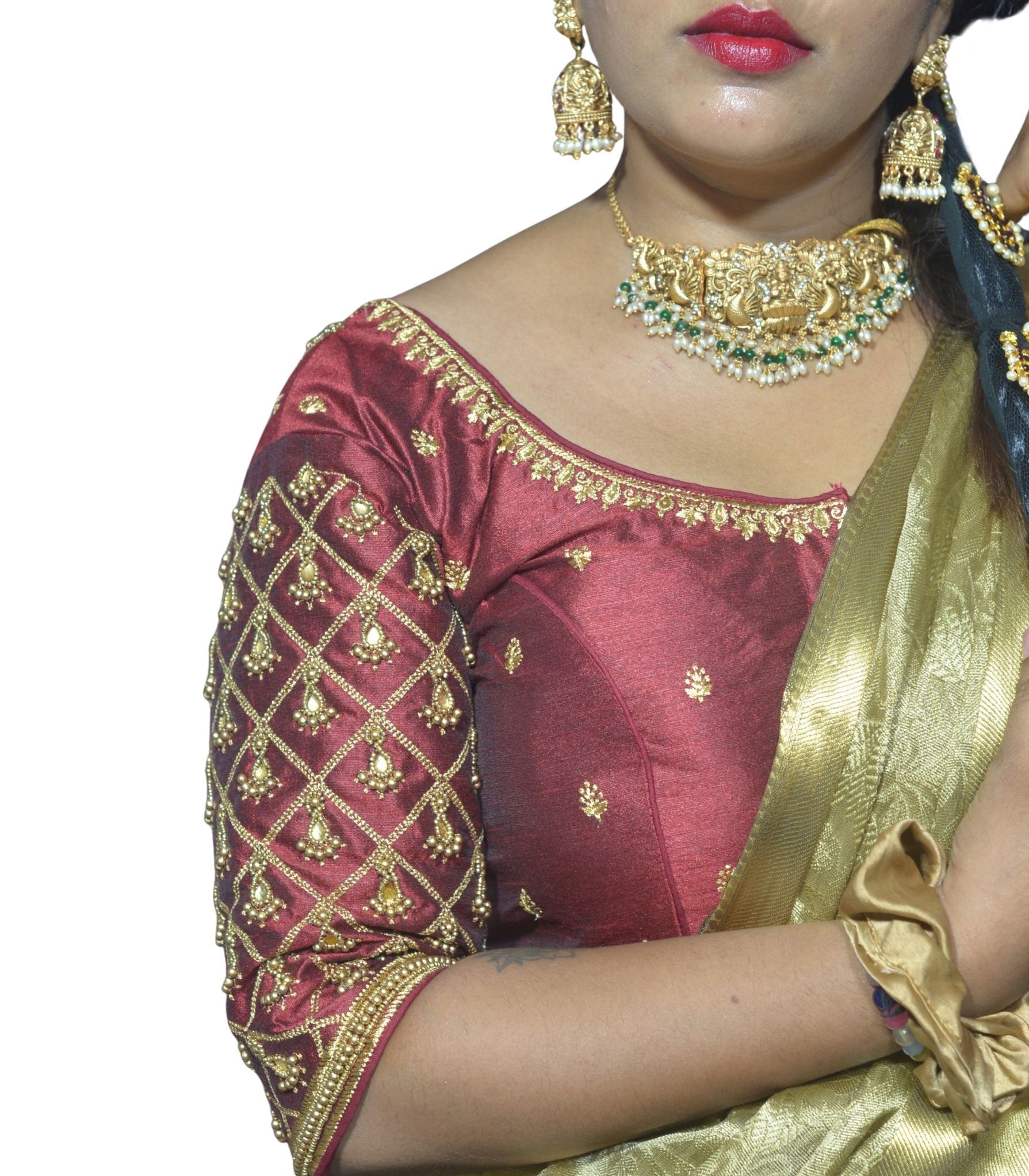 Maroon Blouse with Criss-Cross, Footprint & Bush Embroidery