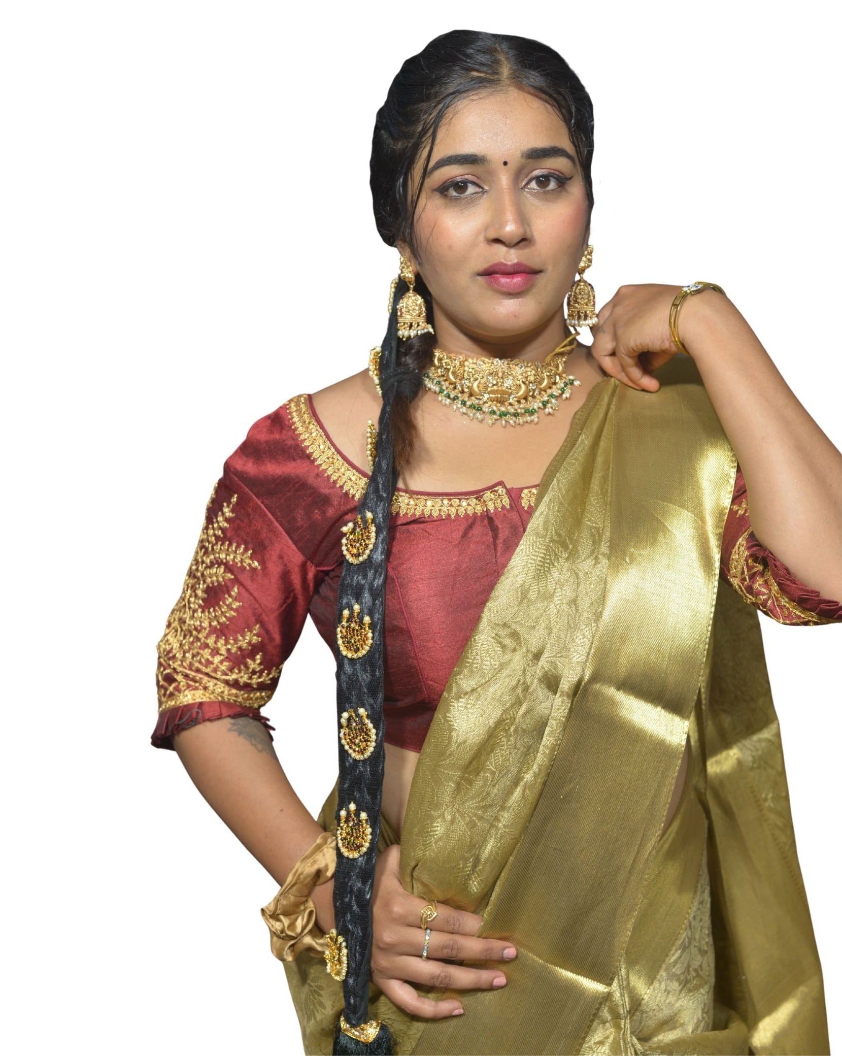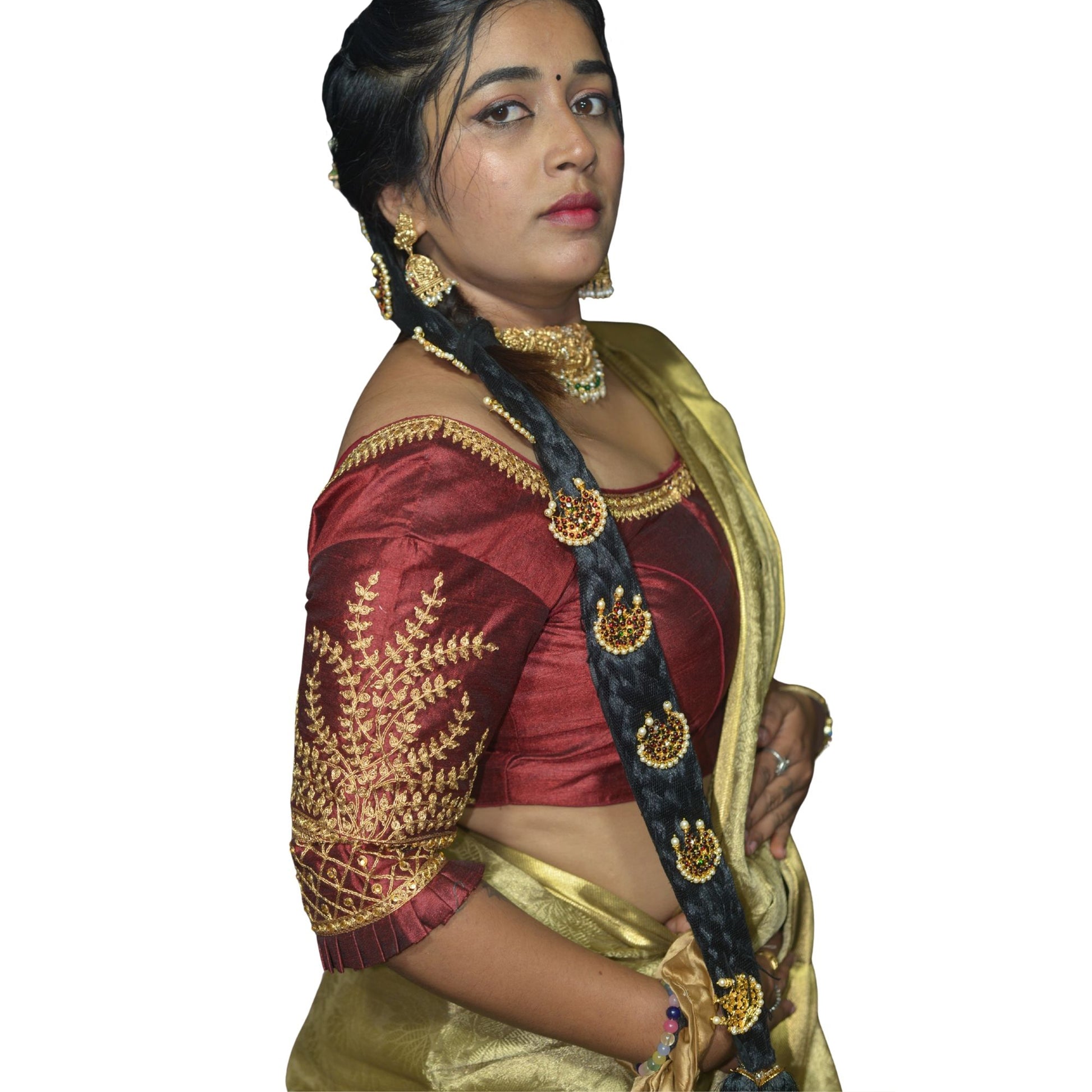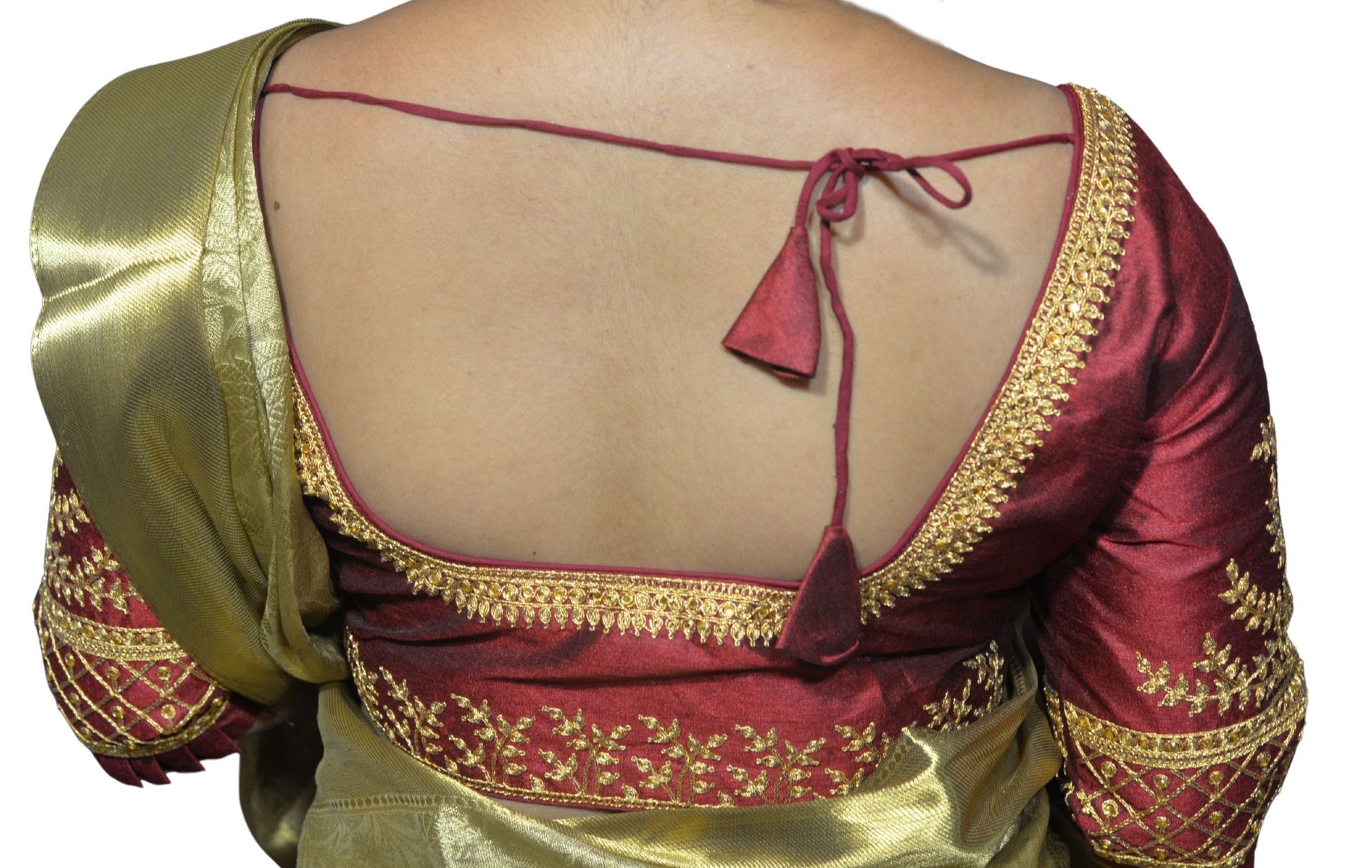 Stylish Maroon blouse featuring cross plus and puff detailing on the sleeves, paired with intricate machine embroidery on the front and back. A modern ethnic piece ideal for festive and semi-formal occasions