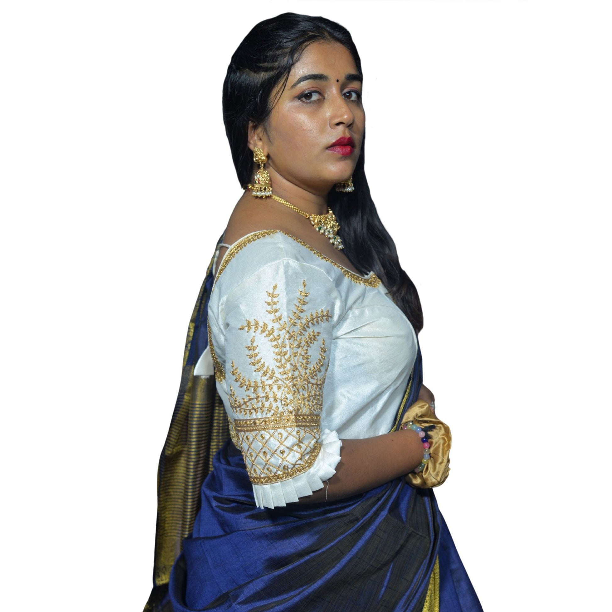 Stylish White blouse featuring cross plus and puff detailing on the sleeves, paired with intricate machine embroidery on the front and back. A modern ethnic piece ideal for festive and semi-formal occasions
