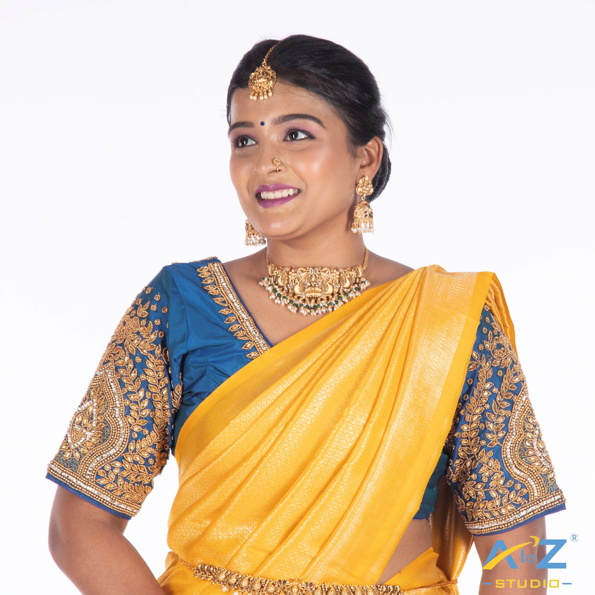 Elevate your style with this Tissue Cloth blouse, featuring a stunning Aari Work ( Gold work) design and a chic Elbow Sleeves. Perfectly crafted in Egyptian Blue, this blouse offers extra margins for a customizable fit and front hook closure.
