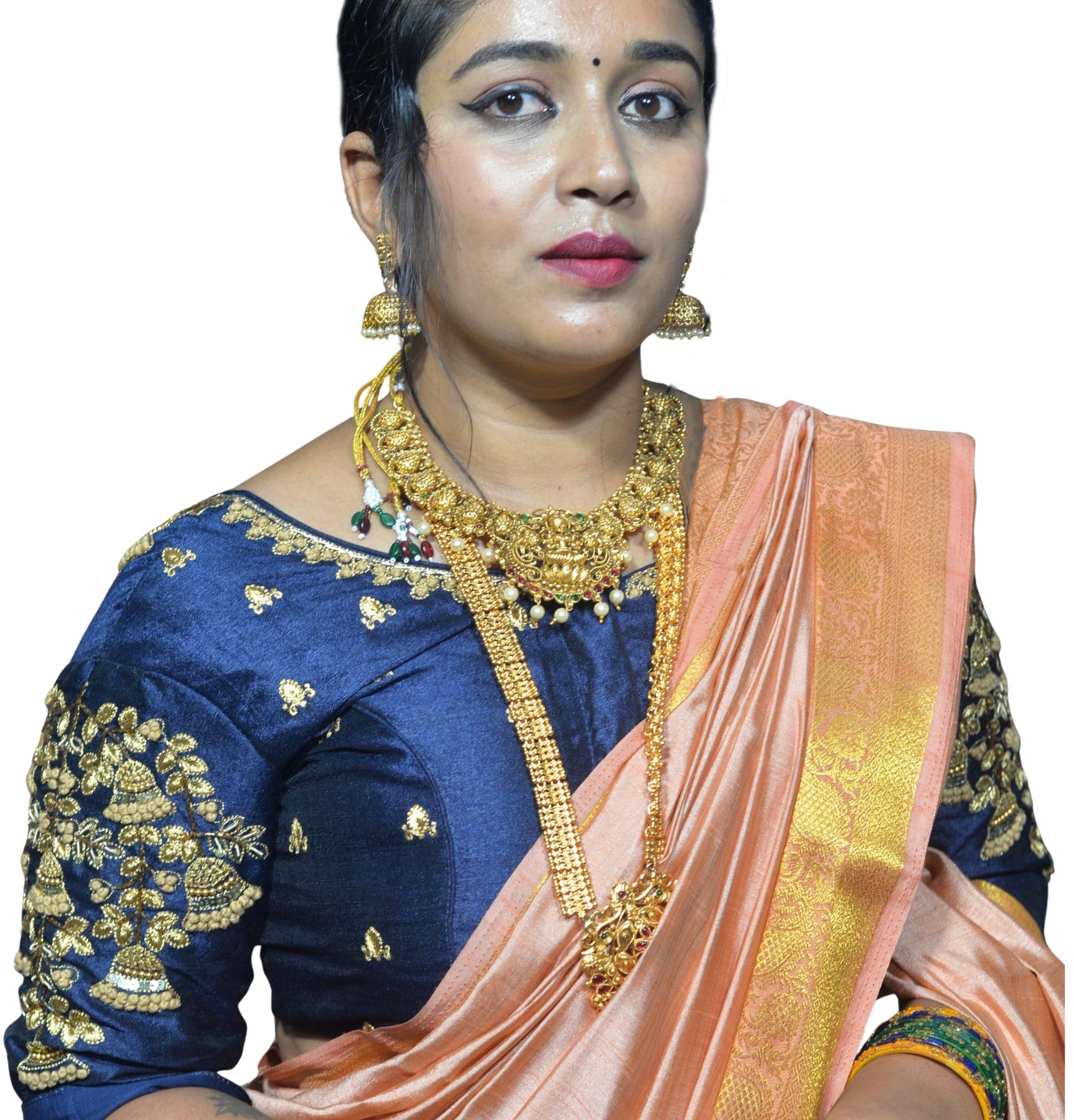 This designer Navy Blue blouse showcases a graceful flower design with multiple branching stems and intricate leaf motifs, blending traditional aari with fine machine embroidery. Ideal for adding a touch of natural elegance to any festive look