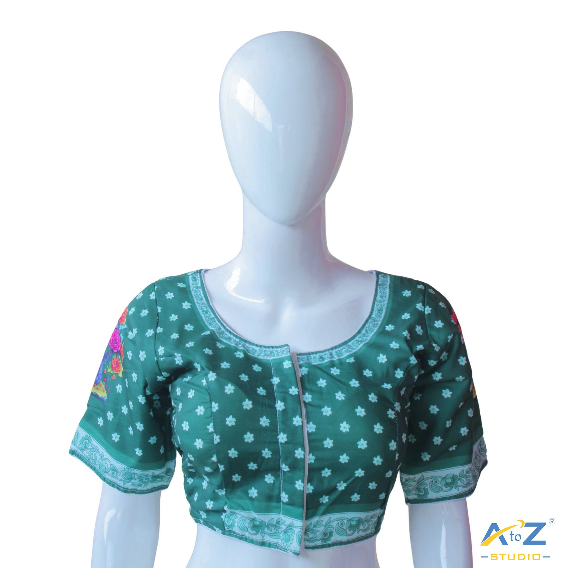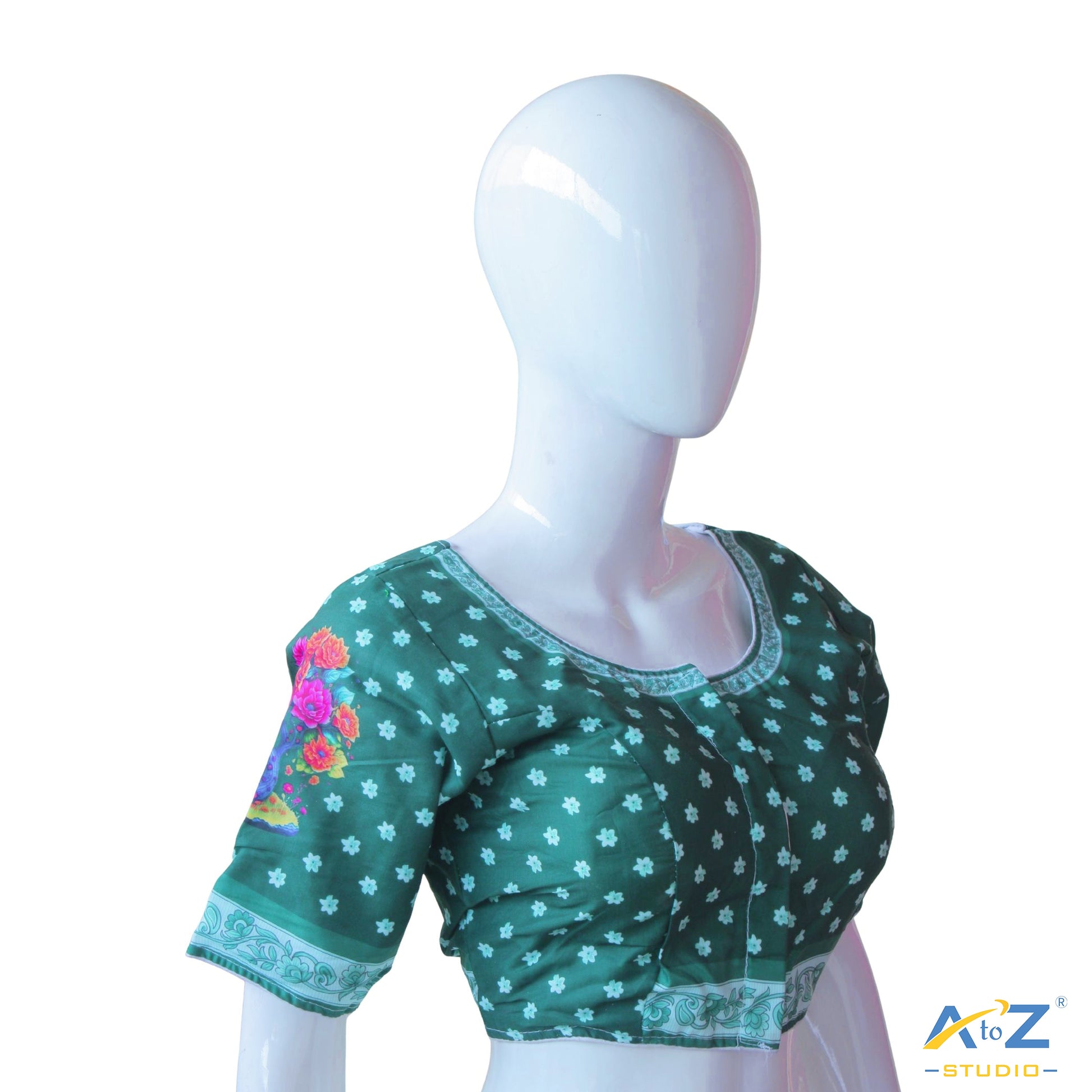 A lush, vibrant floral tree at the center of this blouse stands out against the deep green background. The intricate design adds a touch of nature's beauty, making it a refreshing choice for a bold yet feminine look.