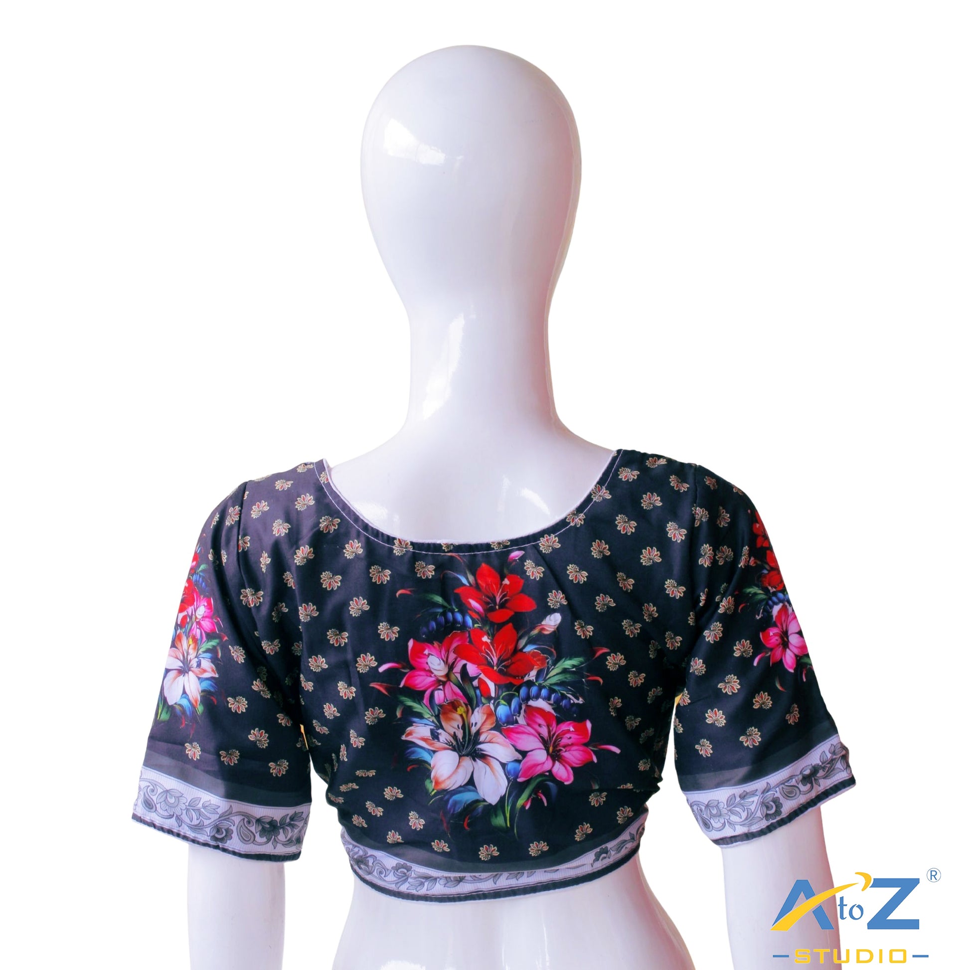 A graceful blend of dark floral prints with vibrant blooms, this blouse exudes elegance. The contrasting floral motifs on a deep black base add a perfect balance of modern style with traditional appeal.