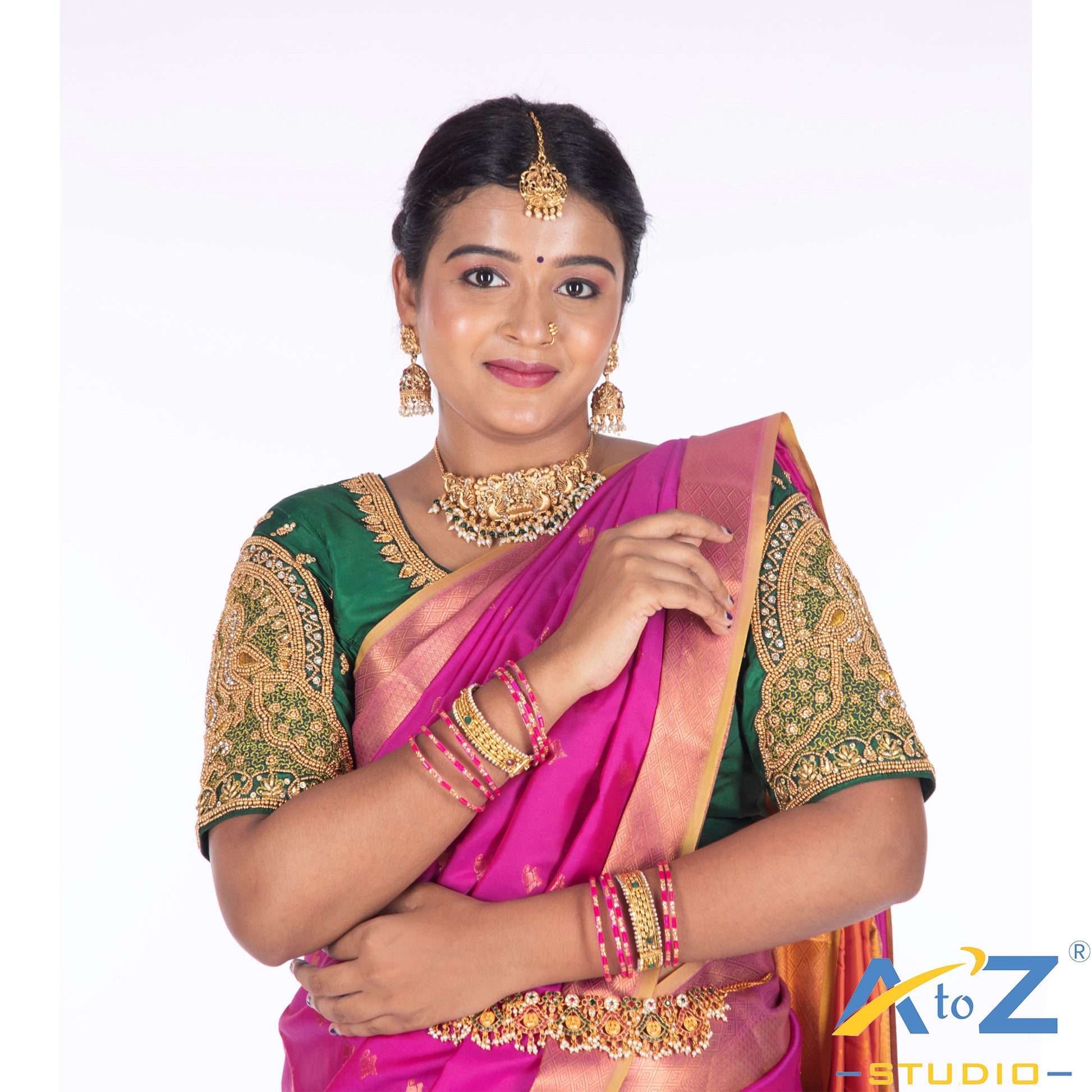 Elevate your style with this Silk Cloth blouse, featuring a stunning Aari Work design and a chic Elbow Sleeves. Perfectly crafted in Forest Green, this blouse offers extra margins for a customizable fit and front hook closure.