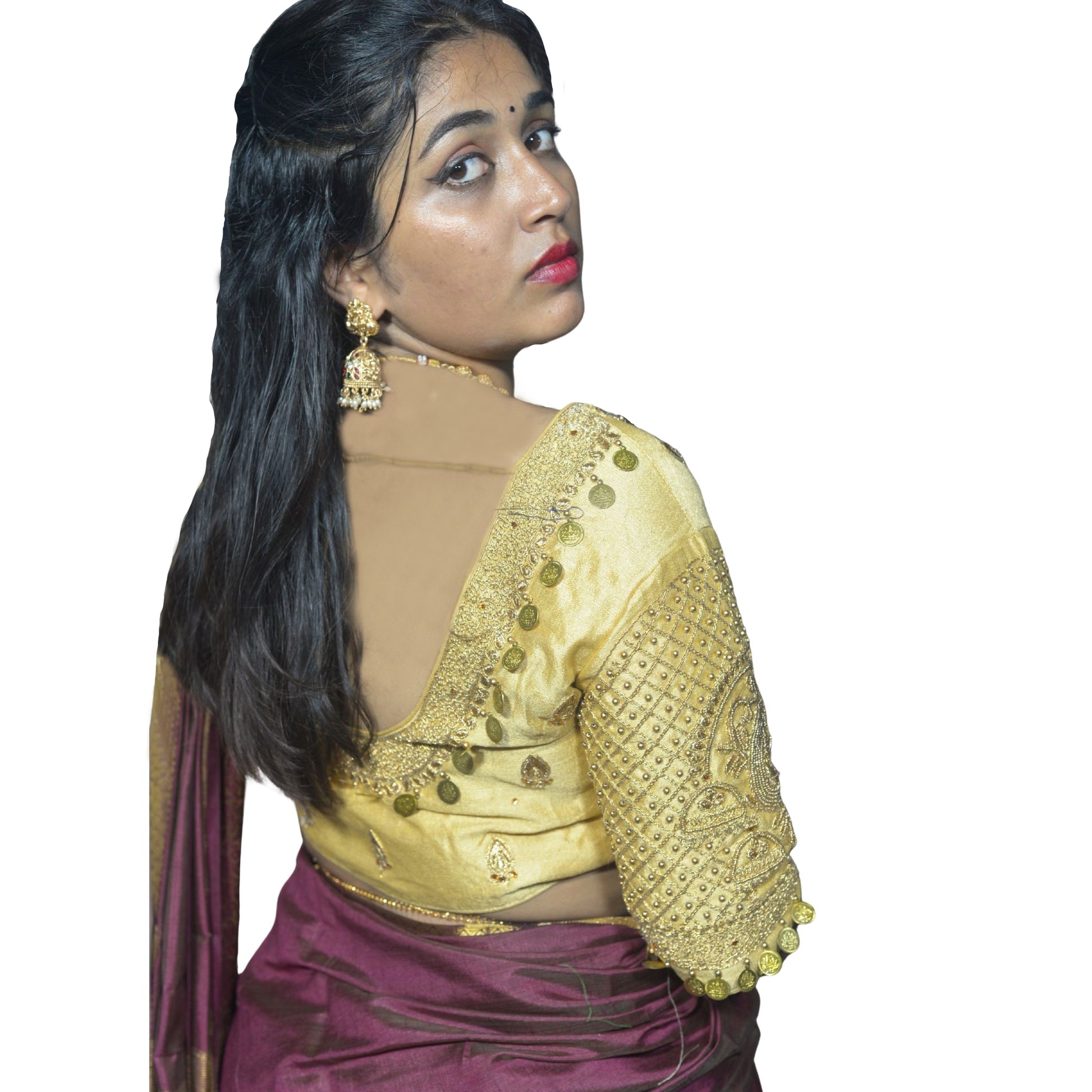 Graceful Gold blouse featuring aari-embroidered sleeves with big moti stones and a flow of Lakshmi coins, perfectly complemented by intricate machine embroidery on the front and back. Ideal for festive and traditional occasions with a touch of opulence