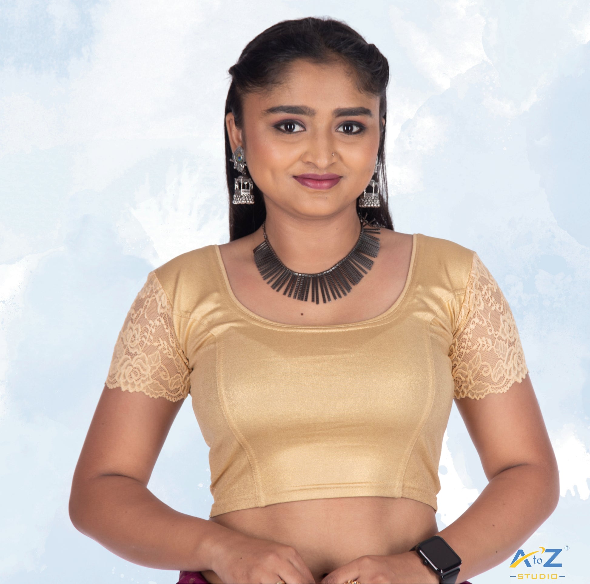 This Gold Lycra Shimmer blouse features net short sleeves, a round neck, and shiny plain and flower designs in the sleeves for a charming, versatile style.