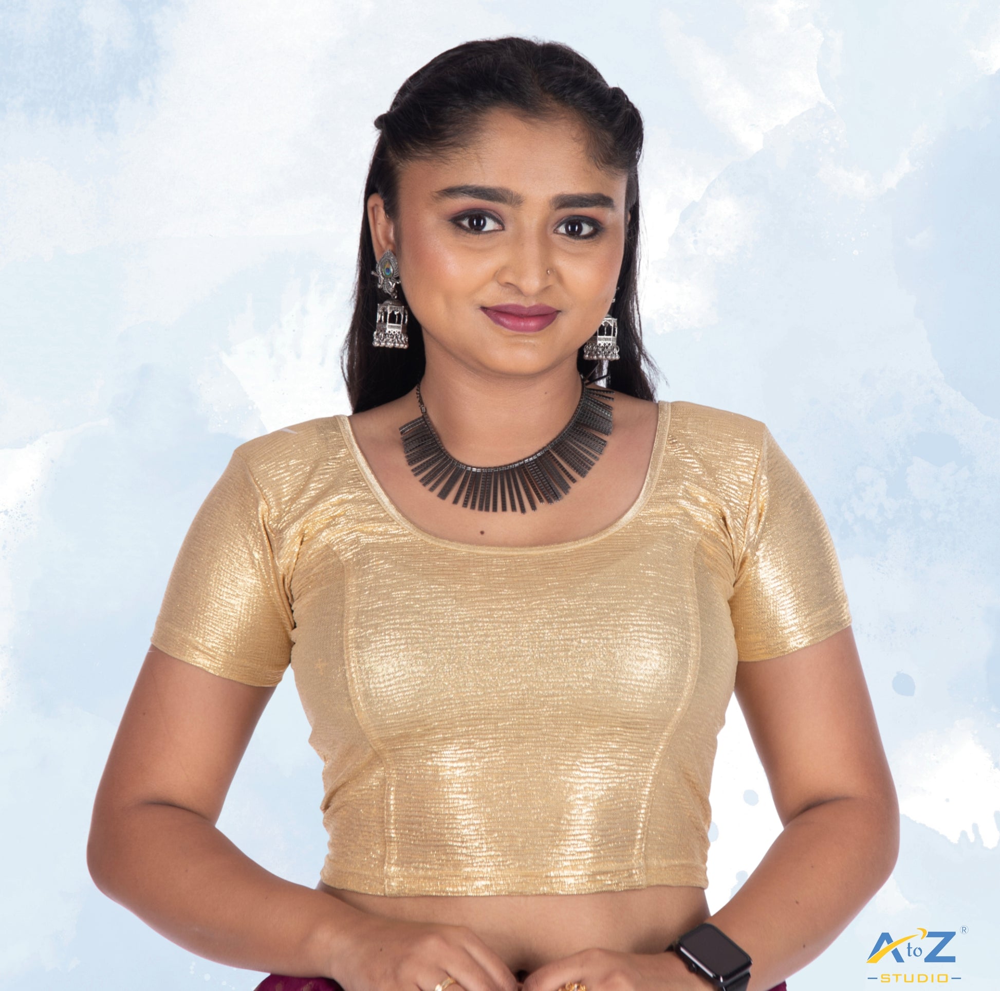 This Gold Lycra Shimmer blouse features short sleeves, a round neck, and a shiny tissue design that exudes elegance.