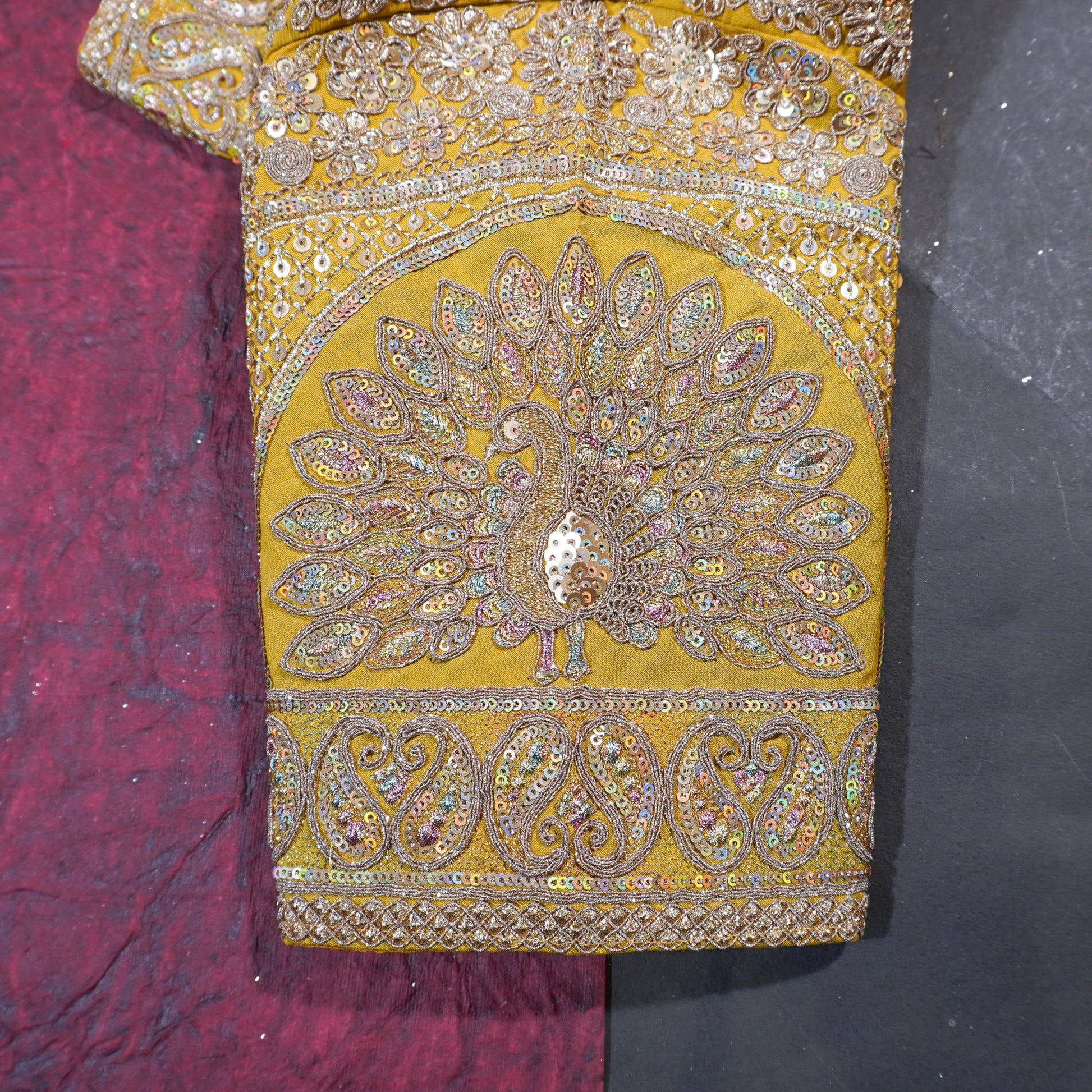 Bright yellow blouse enriched with intricate gold detailing.
