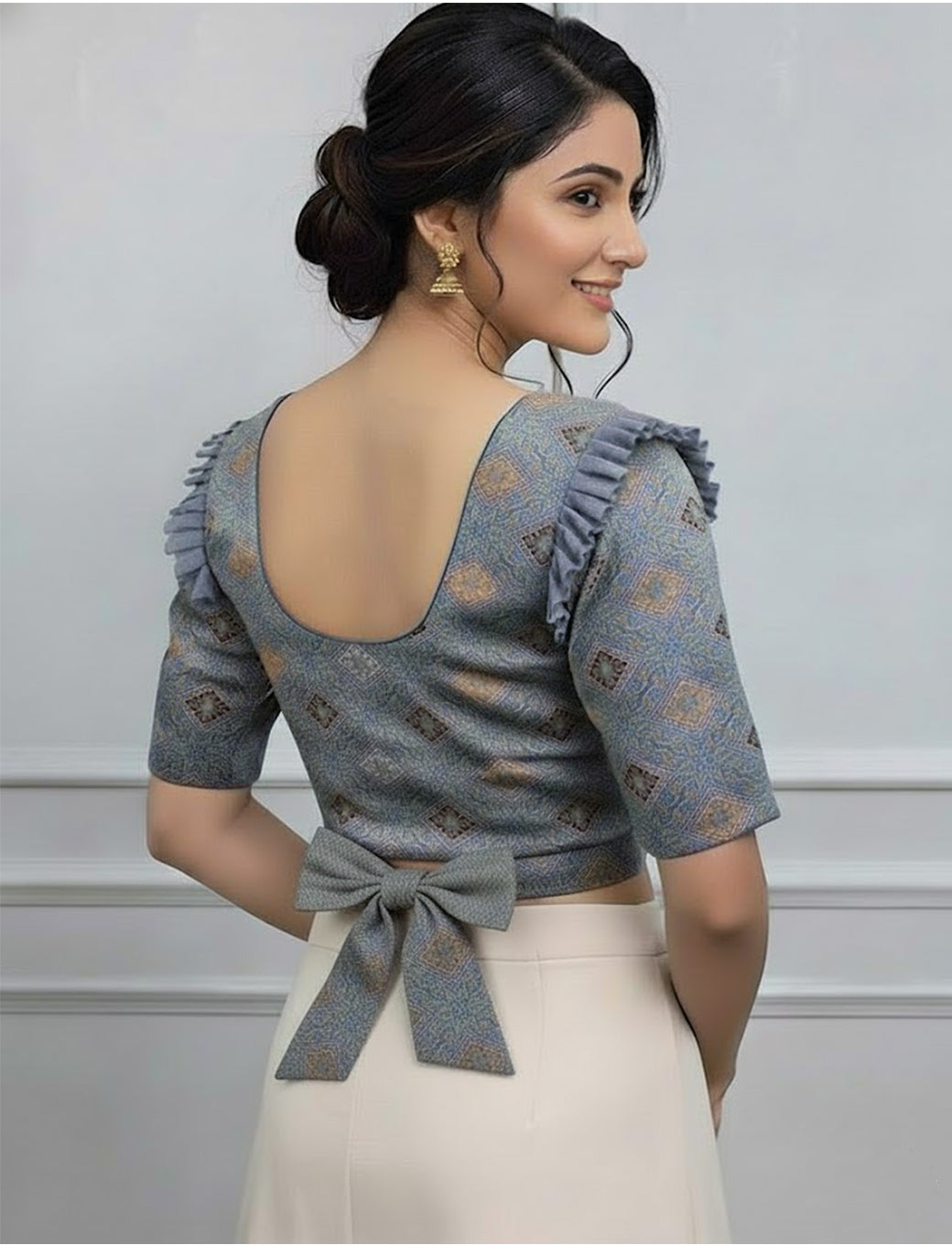 Add a touch of modern elegance with this Grey Crush Fabric Blouse, featuring a chic Round Neck Front and Round Neck Back with a Belt and Bow Detail. The Elbow Sleeves and kite print design make it a versatile and stylish choice for any occasion.