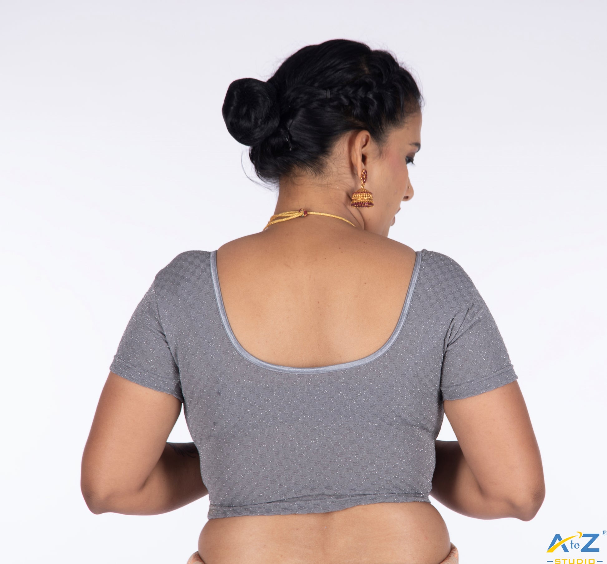 This Grey Crush fabric blouse features short sleeves, a round neck, and a shimmering tissue small square design, adding a touch of sophistication.