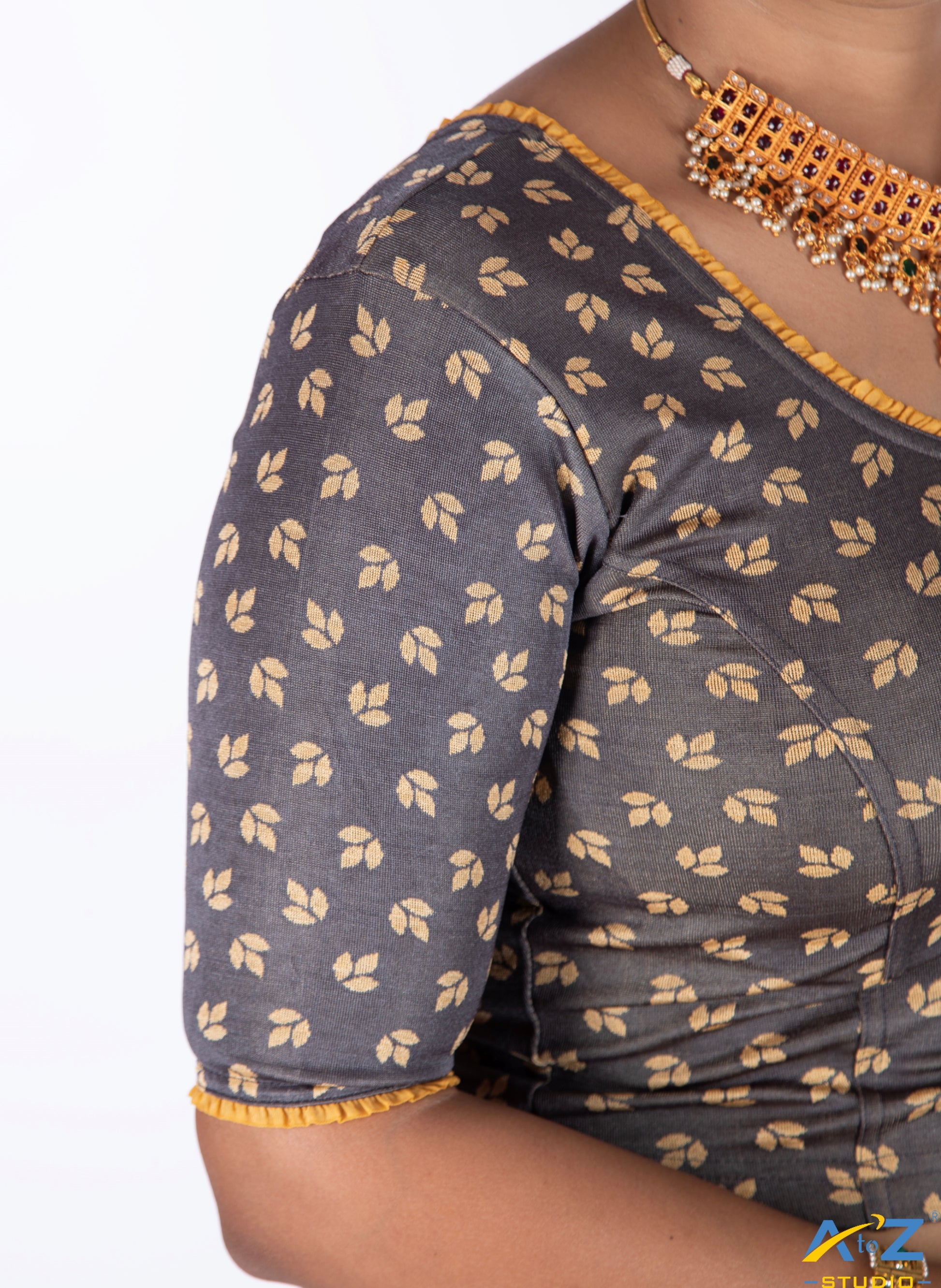 Grey nylon lycra blouse with round neck in the front and V-shaped back, highlighted by a small leaf design with frills from the collar to back. Timeless and versatile for any ethnic wardrobe. Perfect for special events.