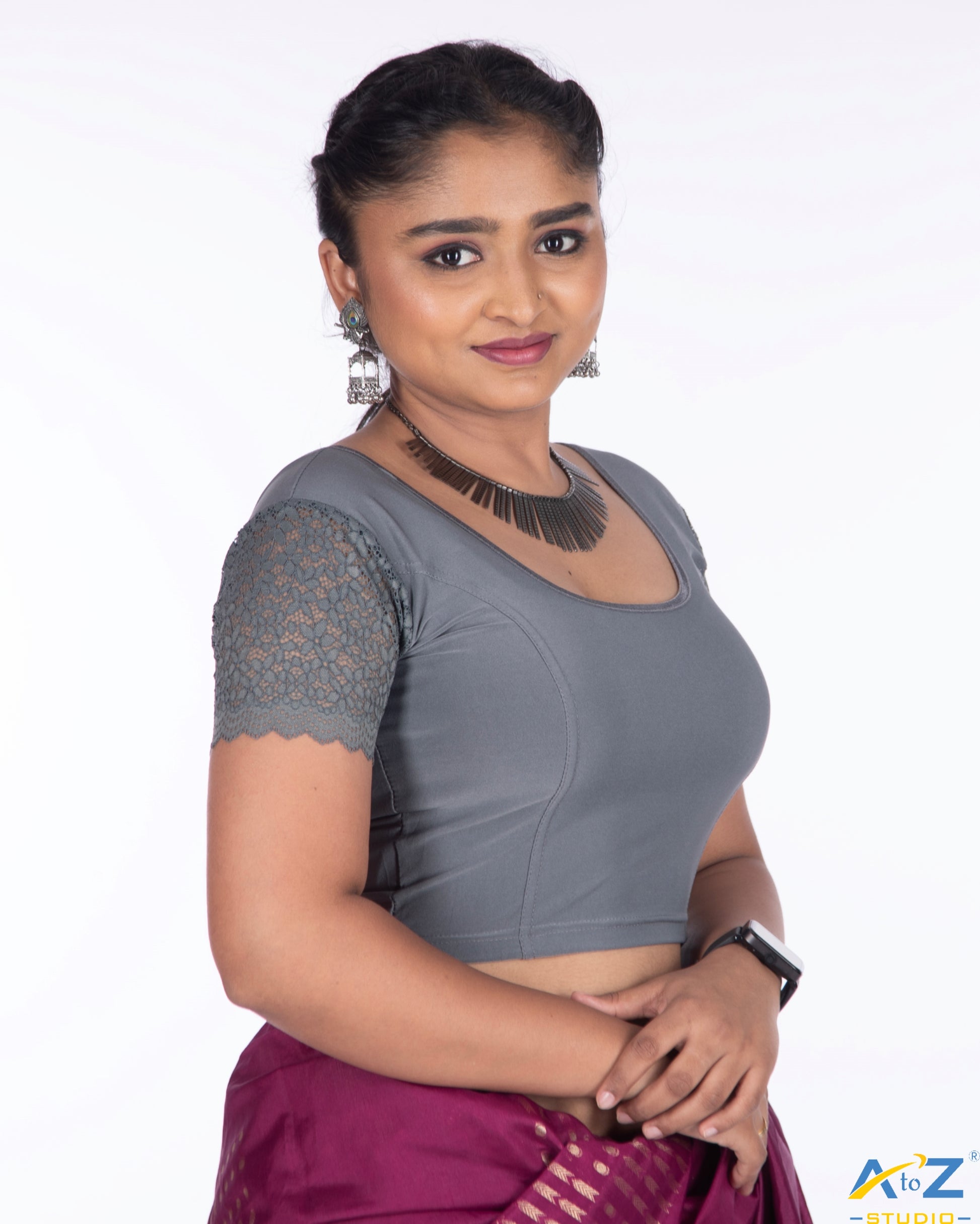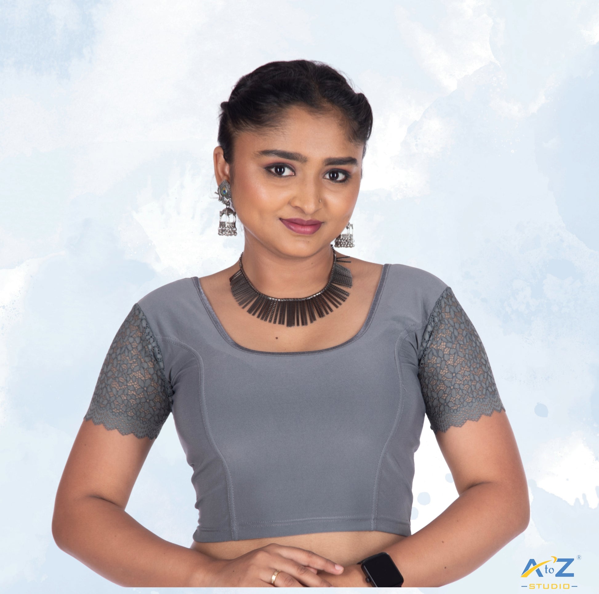 This Grey Polyester Lycra blouse combines net short sleeves, a round neck, and a beautiful plain and flower print in the sleeves.