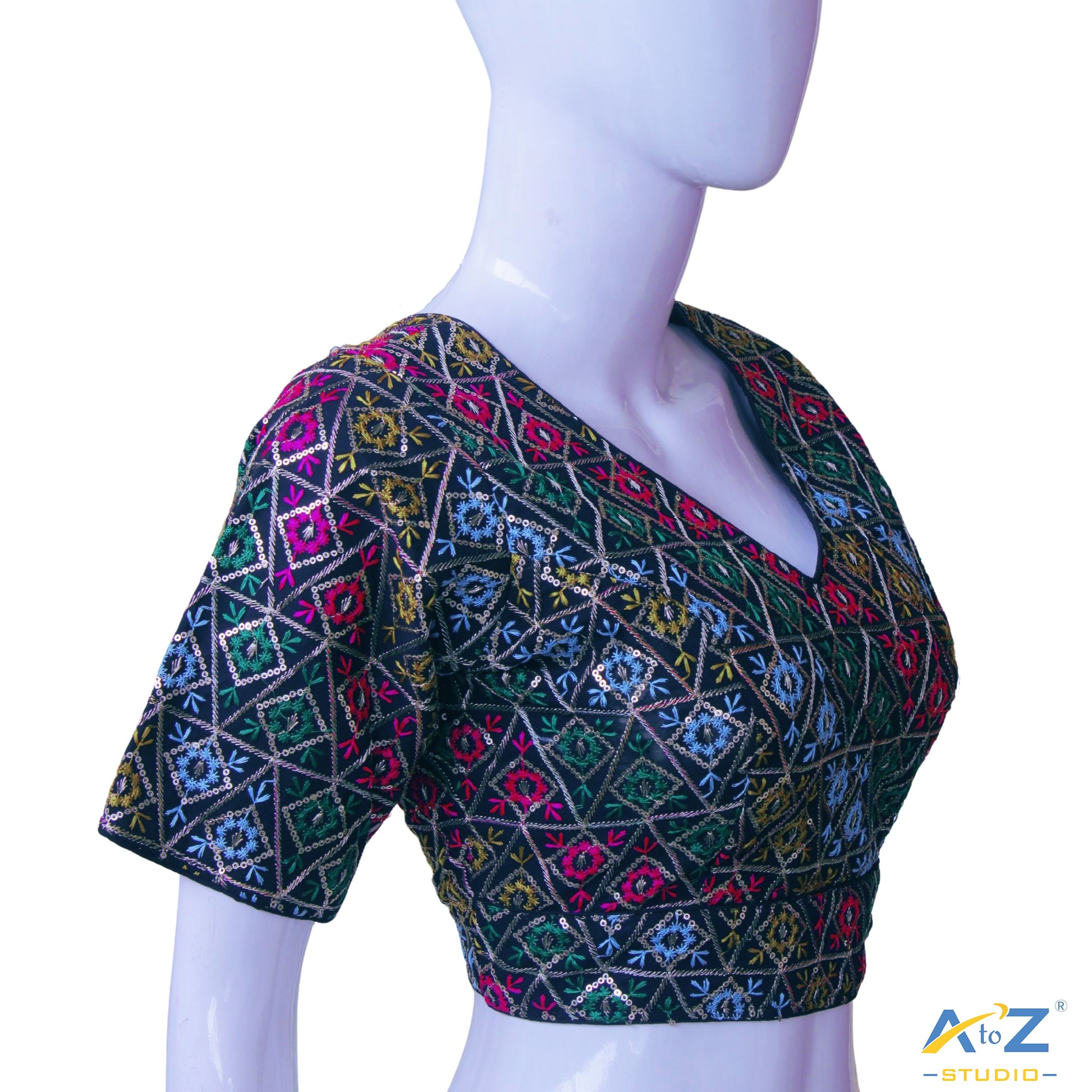 Design : This intricately designed choli showcases exquisite hand-embroidery with floral motifs in vibrant colors like pink, yellow, and green