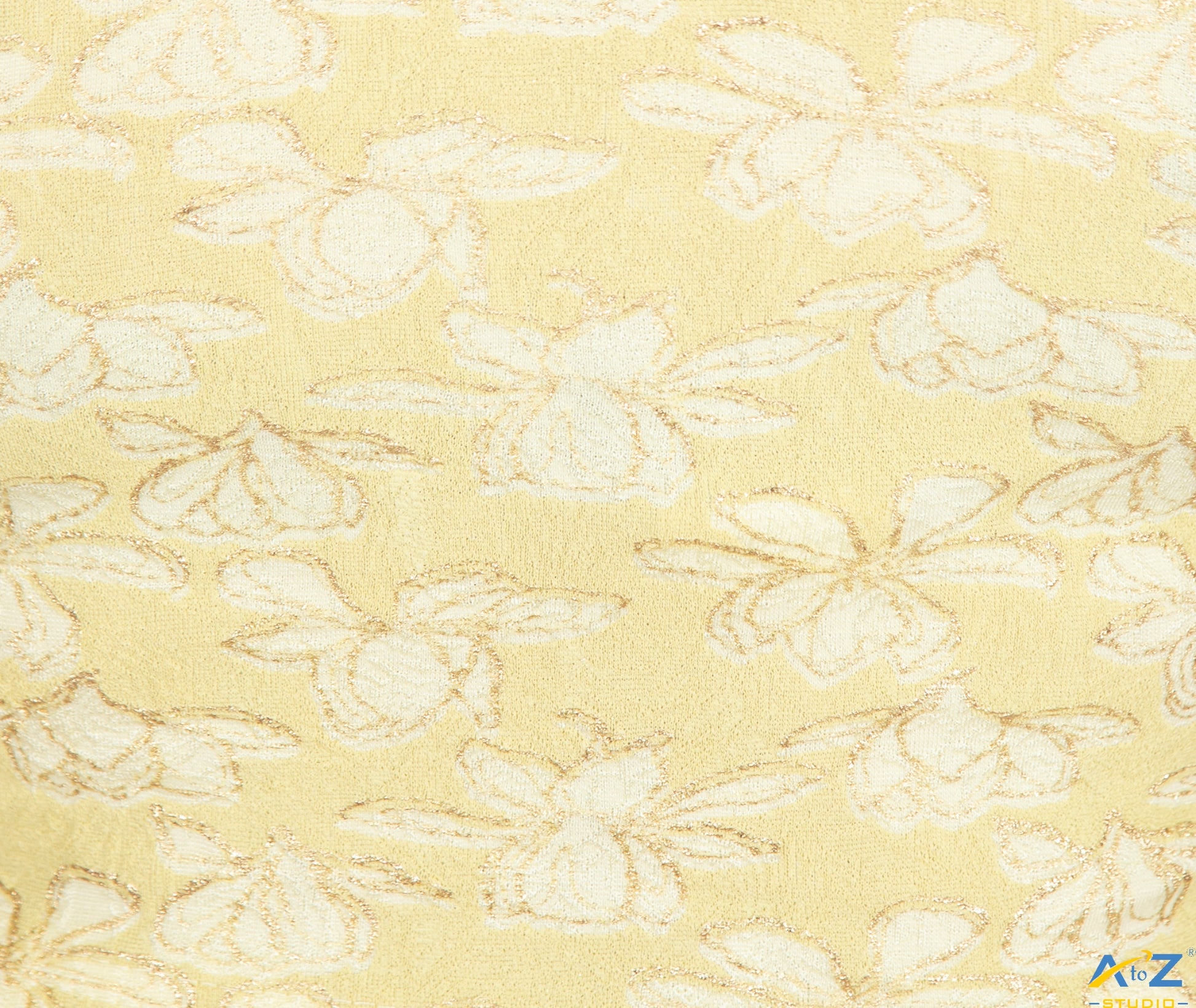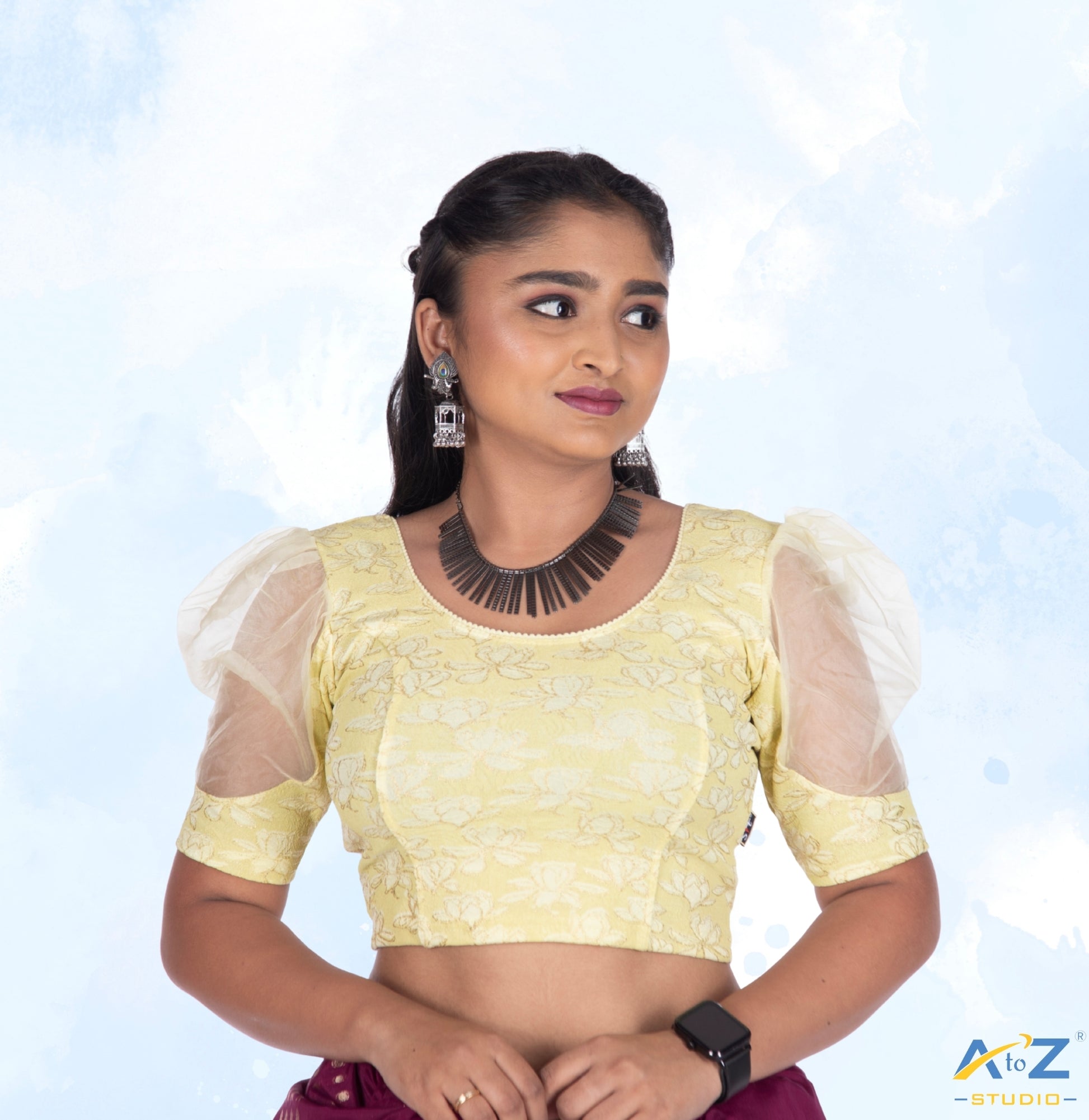 This lemon cotton lycra blouse features elbow balloon sleeves, a round neck, and a trendy lotus print design. Fresh and versatile.