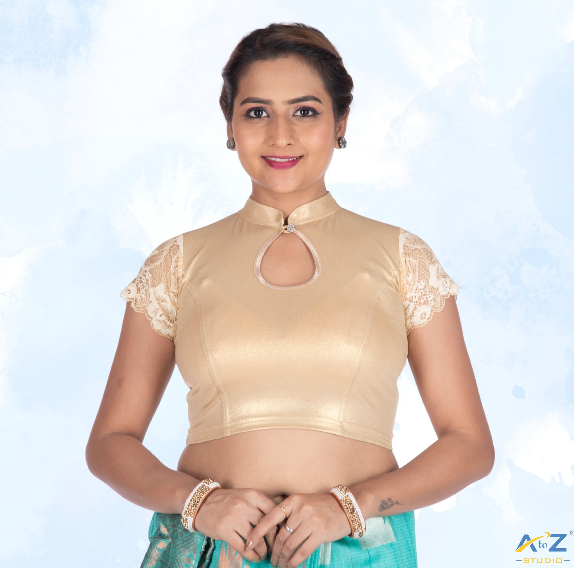 This Light Gold Lycra Shimmer blouse features net short sleeves with a stylish collar V-neck and a 3-inch small hole design, a fully closed back with a collar neck, and a shiny plain finish with elegant floral designs on the sleeves.