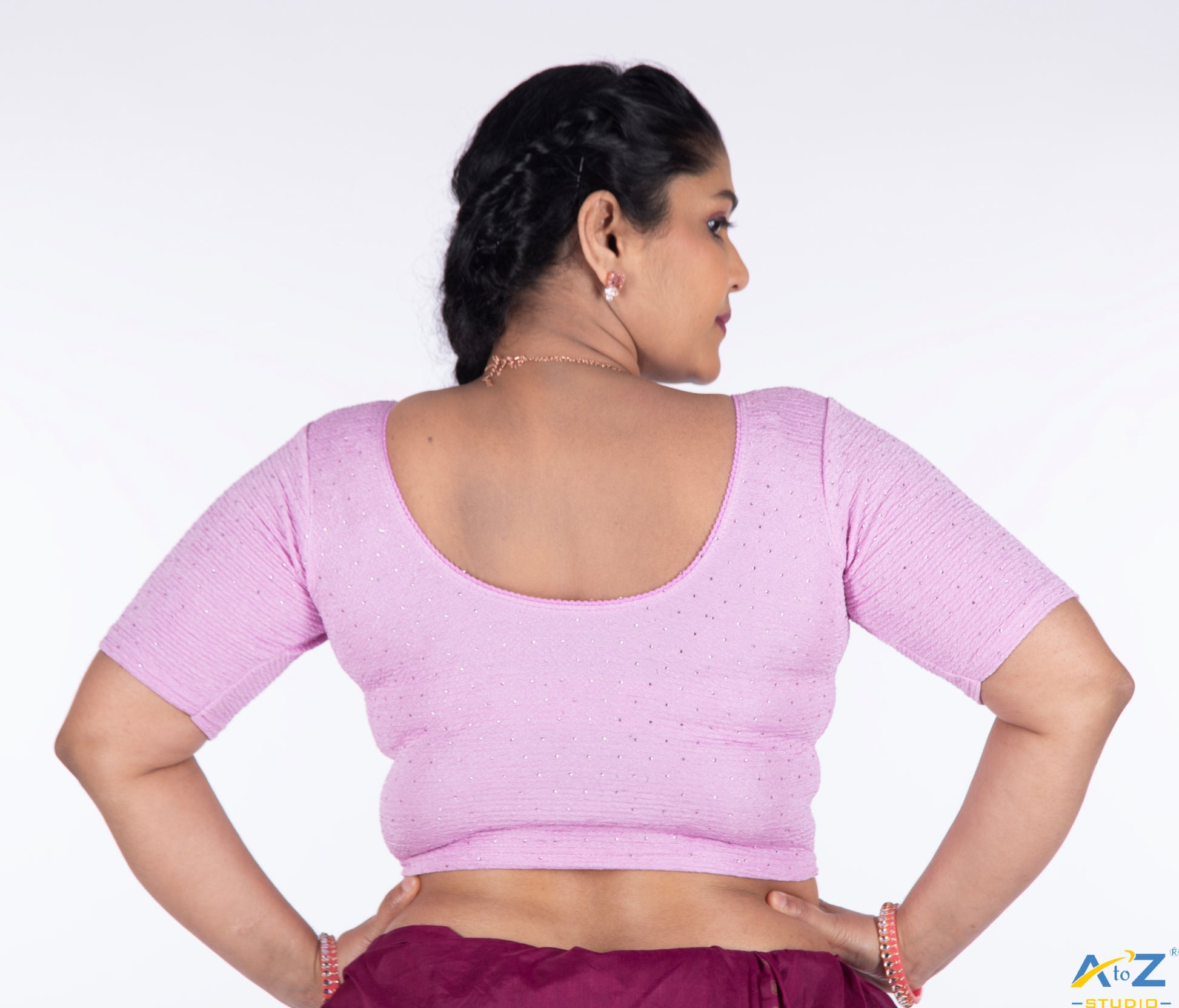 The Lilac Crush Fabric Blouse combines timeless elegance with a round neck, round back, stylish elbow sleeves, and a tissue design adorned with delicate stone work.