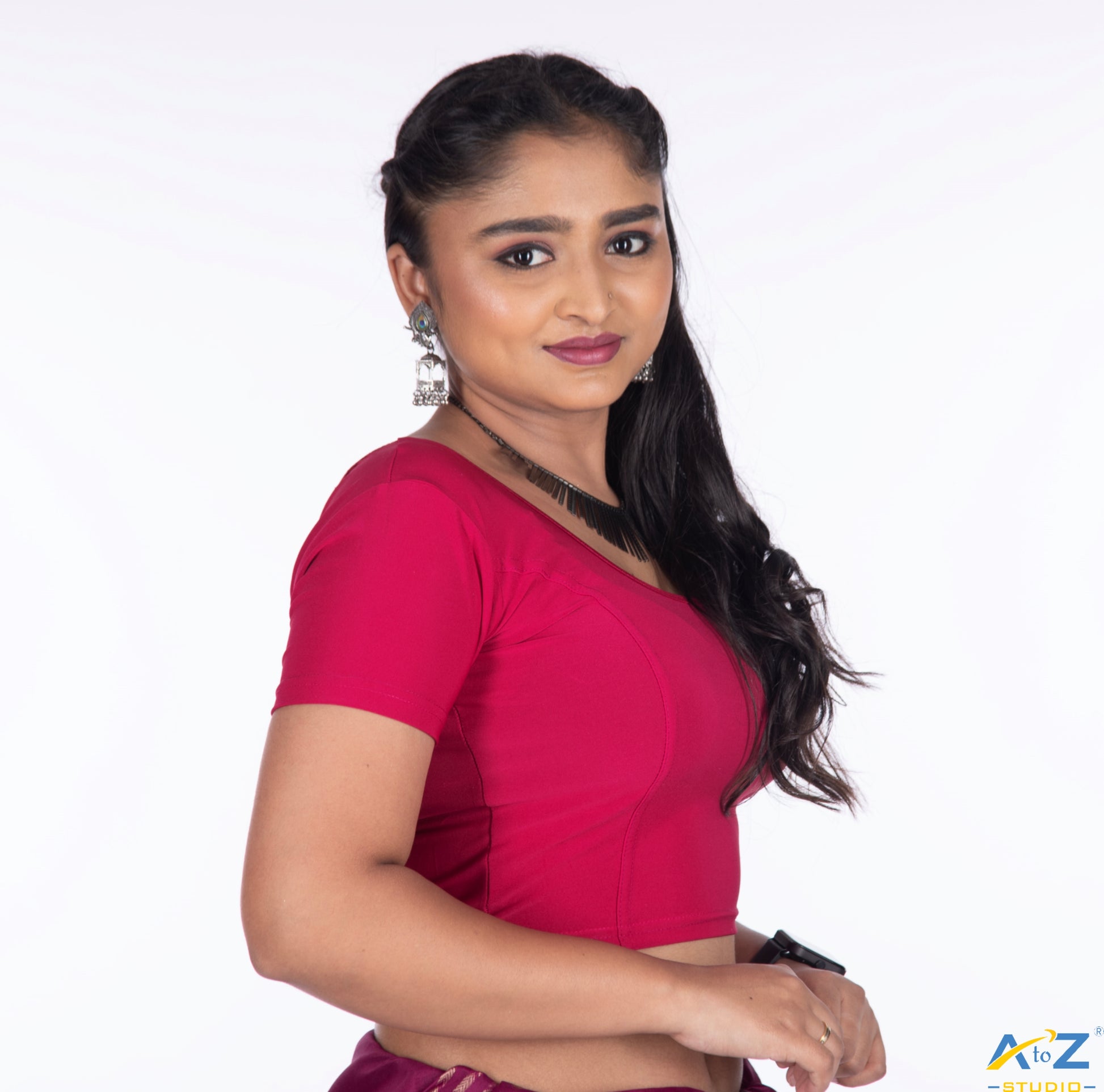 Magenta Polyester Lycra brings elegance to this short sleeve blouse with a round neck and minimalistic, plain design.