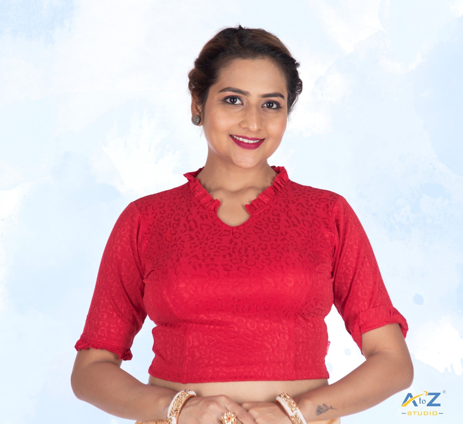 Maroon Cotton Lycra elbow sleeves with gota patti design and V-neck. Featuring a frill collar with a cheetah design for a bold, statement-making style. A comfortable and fashionable choice.